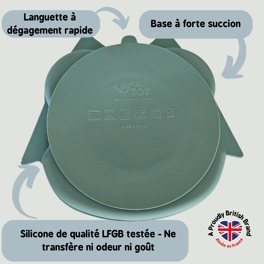 Nos ventouses pour bébés sont fabriquées en silicone LFGB de qualité supérieure. La silicone LFGB ne transmet PAS les odeurs ni les goûts. Les alternatives moins chères en silicone non LFGB peuvent altérer les aliments avec des odeurs bizarres. C'est pourquoi Tidy Tot n'utilise que du silicone LFGB dans sa gamme. Il est approuvé par la FDA, sans BPA, sans danger pour les aliments et sans toxines. Il est conforme à toutes les réglementations du Royaume-Uni, de l'UE, des États-Unis et du Canada en matière de sécurité alimentaire, ce que vous ne trouverez tout simplement pas dans les produits bon marché. Vous pouvez être sûr que votre ventouse Tidy Tot est durable et sûre, et qu'elle pourra être utilisée aussi longtemps que vous et votre bébé le souhaiterez.