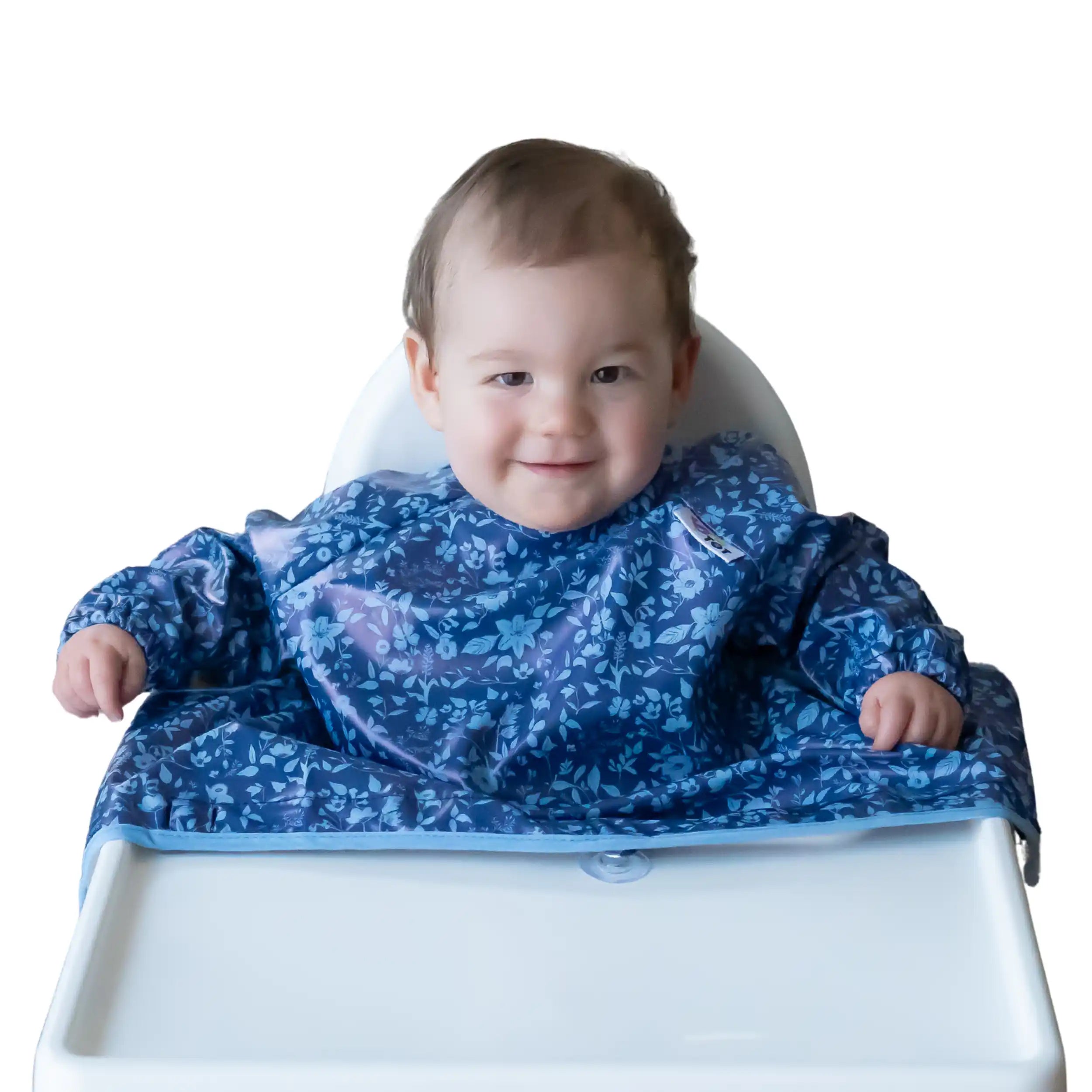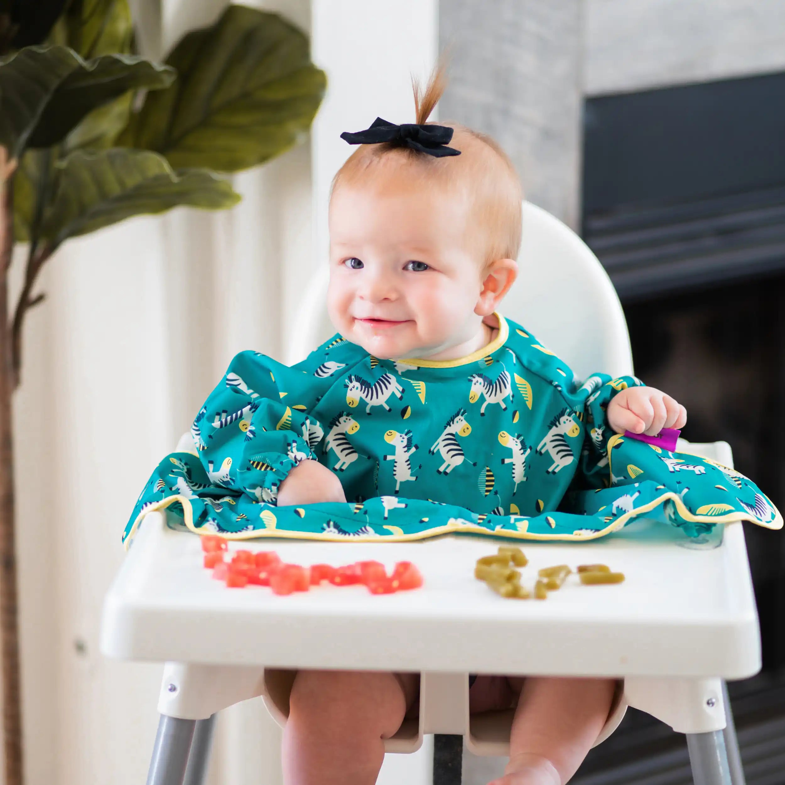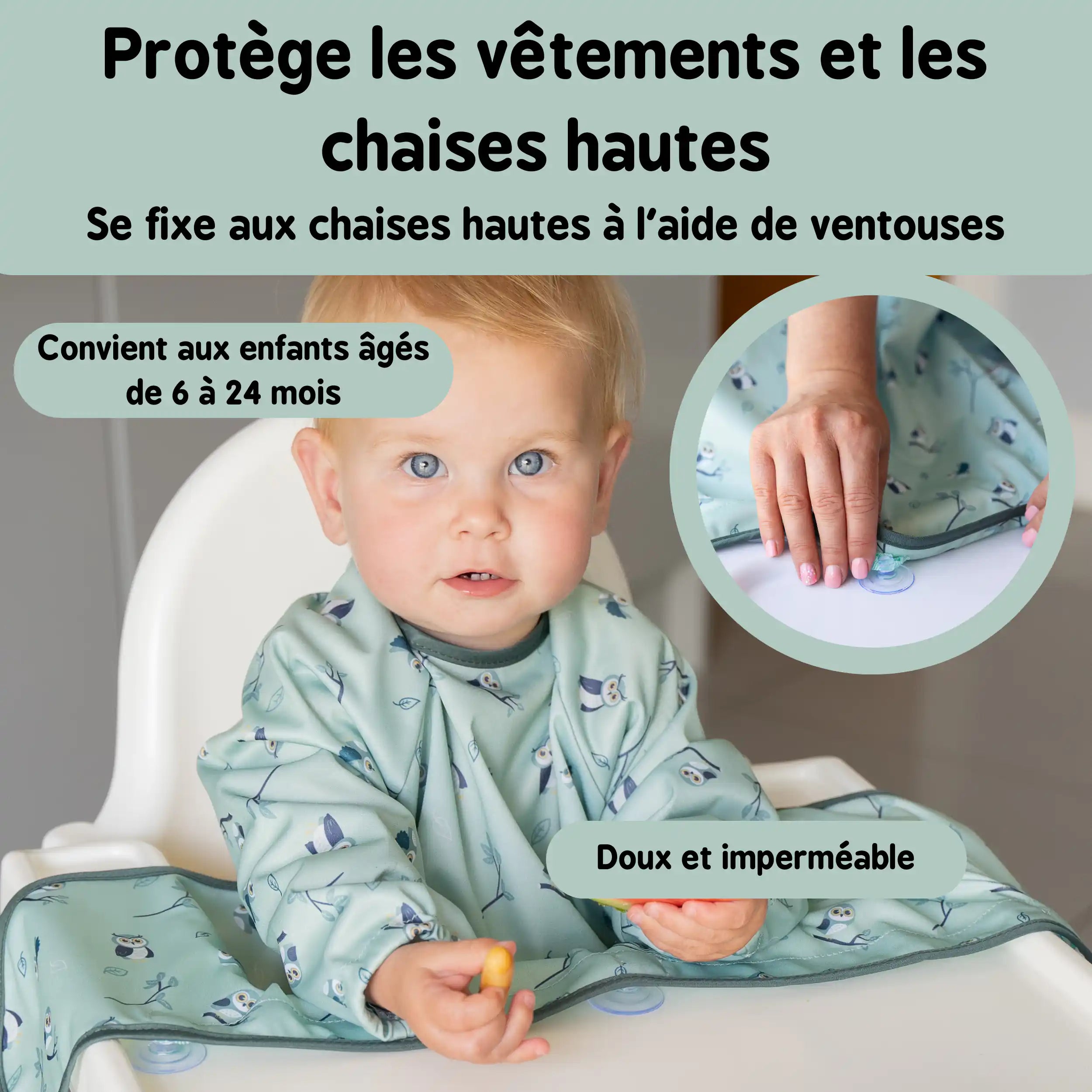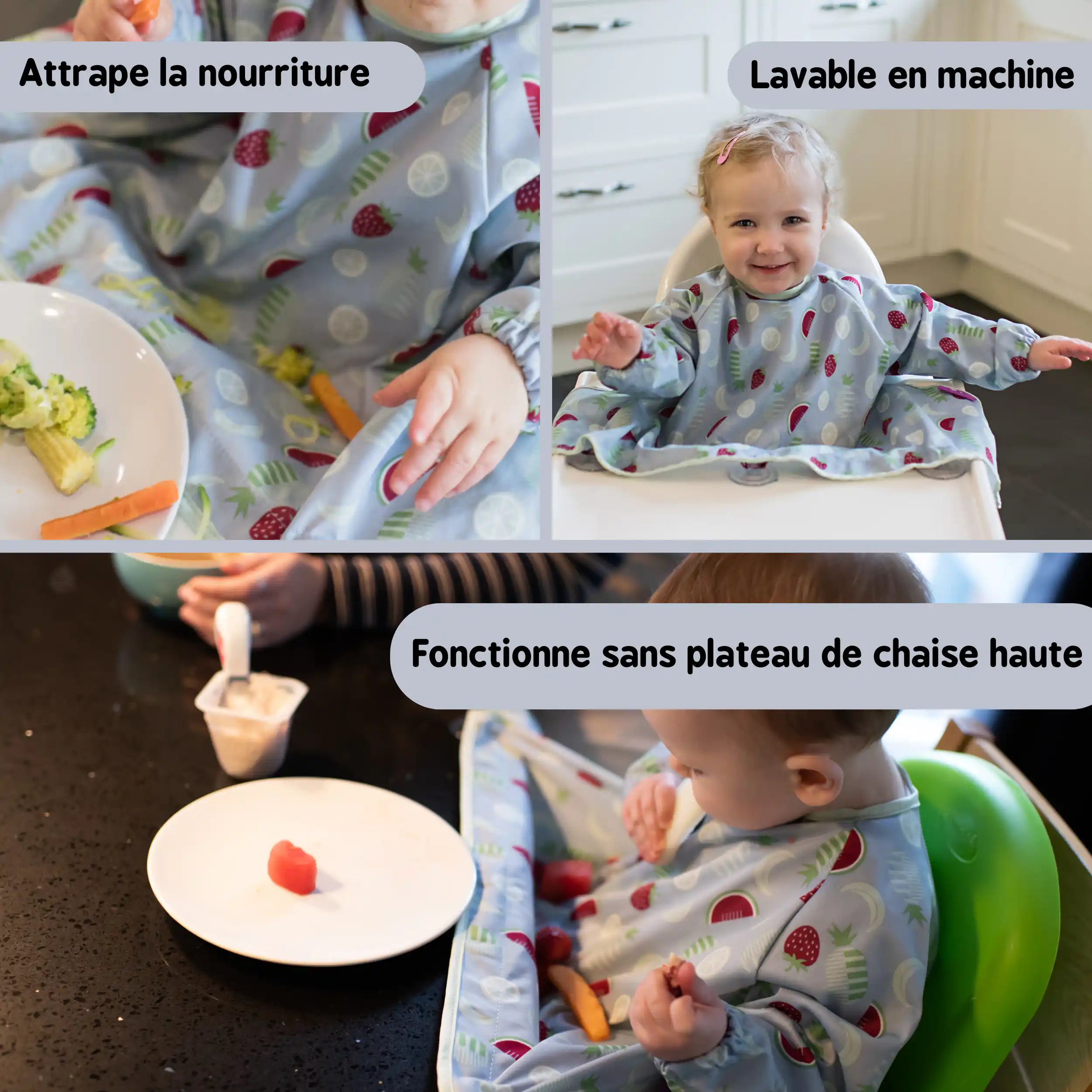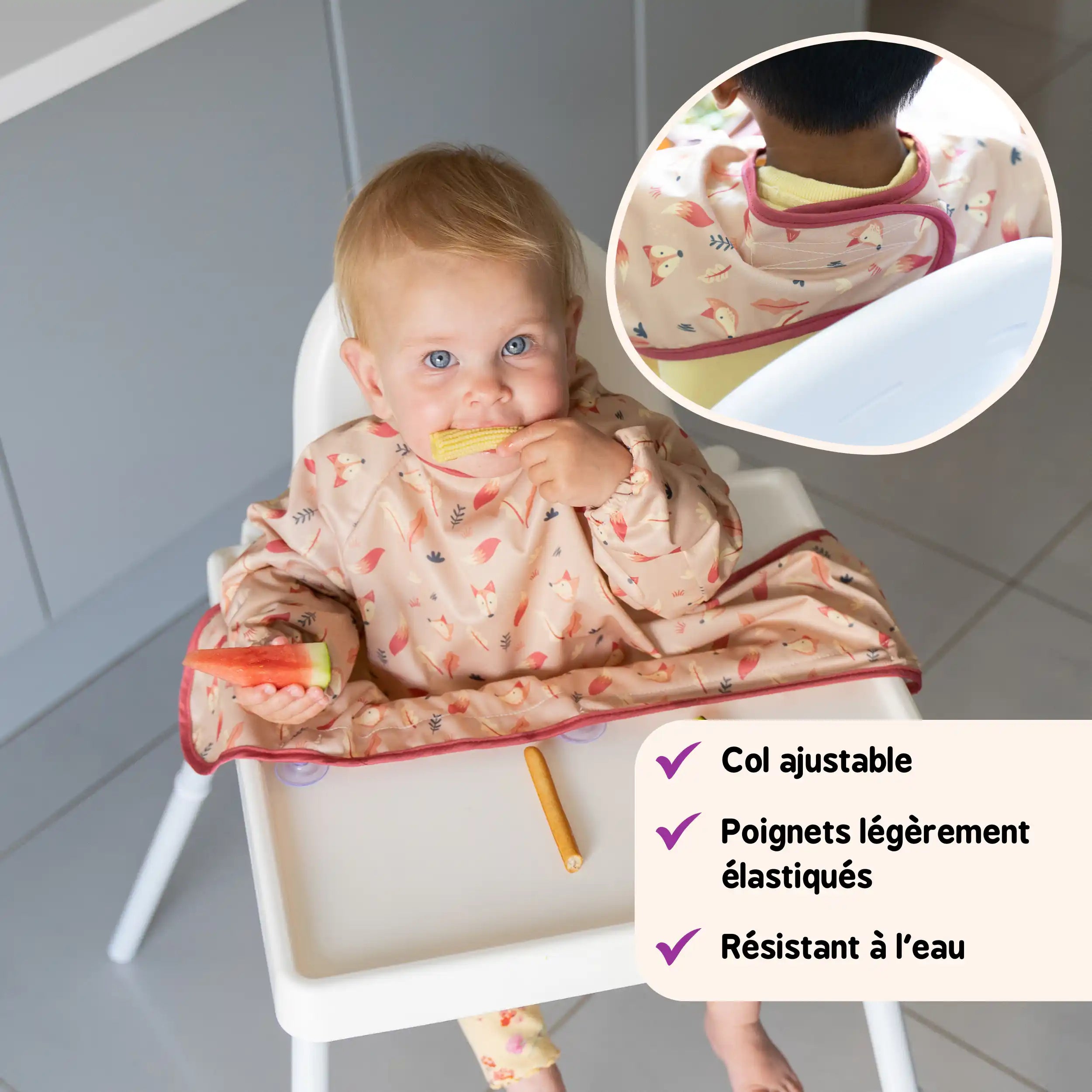 Avec ses manches longues pour une protection complète, une fermeture au cou ajustable et sa matière super douce et résistante à l’eau, ce bavoir protège entièrement les vêtements et le siège des chaises hautes des salissures et éclaboussures de la diversification alimentaire.