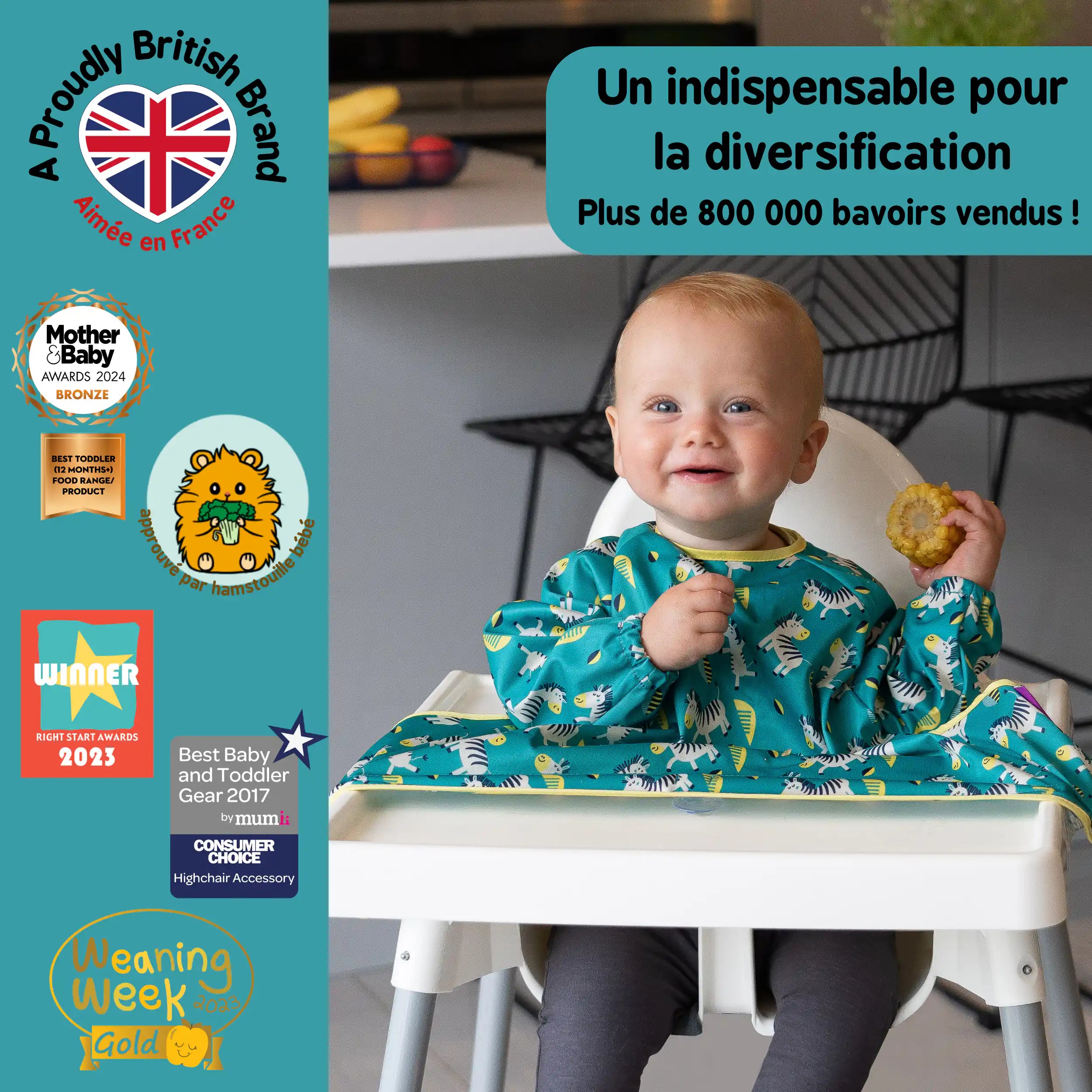 Tous nos bavoirs sont entièrement imperméables, lavables en machine, conçus pour la diversification menée par l’enfant (DME) et soumis à des contrôles qualité rigoureux. Ils sont ajustables à l’encolure, dotés de poignets élastiqués et pensés pour accompagner bébé tout au long de la diversification.