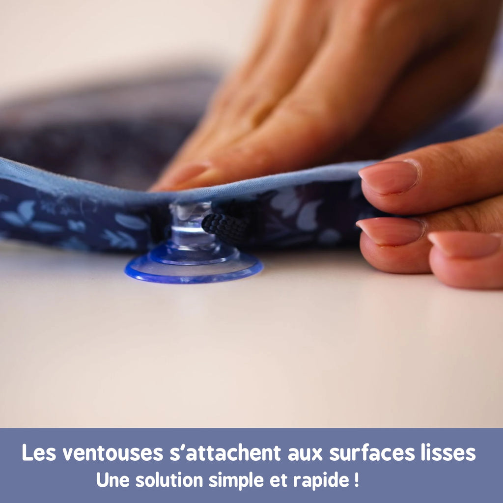 Mettez le bavoir à votre bébé, puis asseyez-le dans sa chaise haute ou son réhausseur de table puis collez les ventouses sur la chaise haute, le plateau ou sur la table.