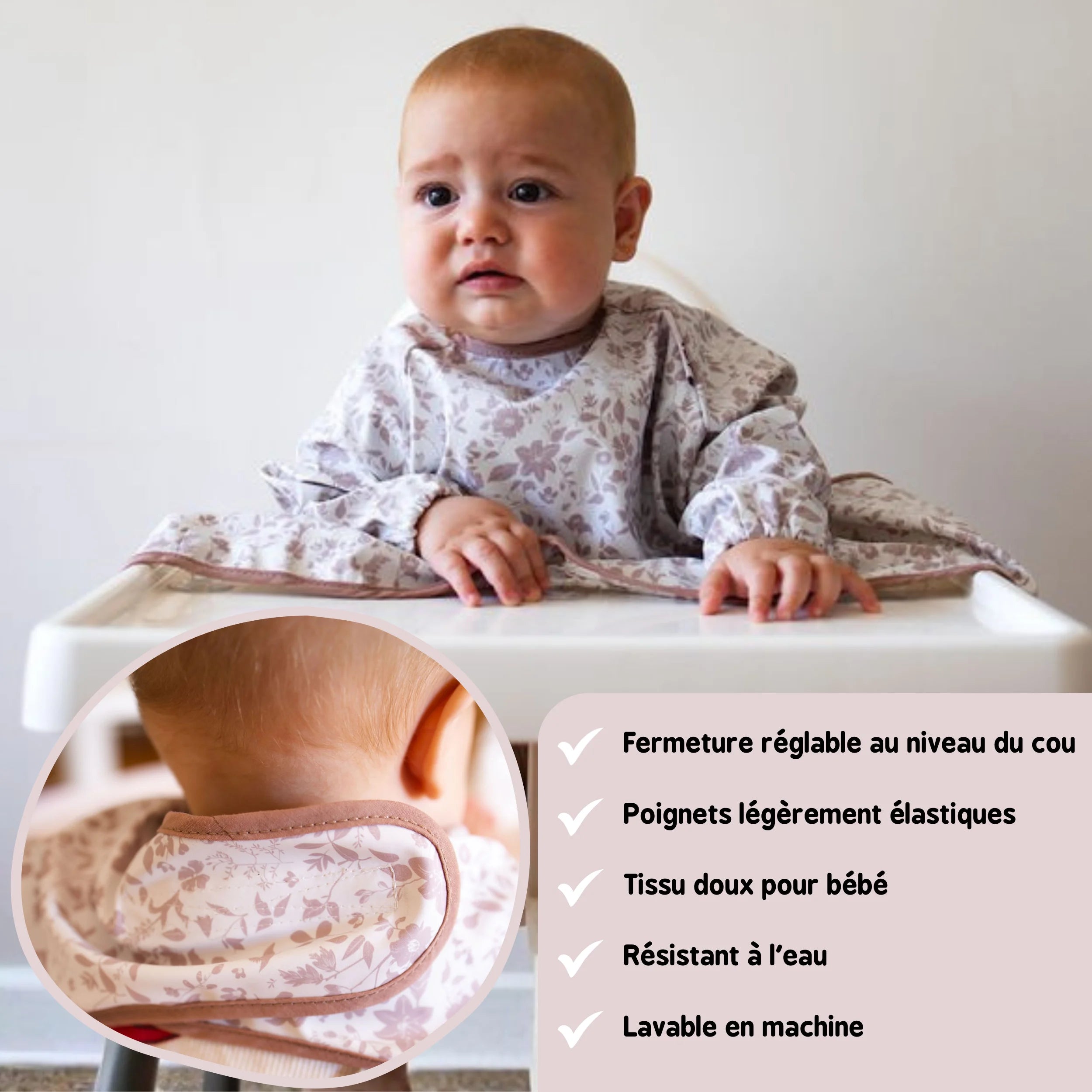 Avec ses manches longues pour une protection complète, une fermeture au cou ajustable et sa matière super douce et résistante à l’eau, ce bavoir protège entièrement les vêtements et le siège des chaises hautes des salissures et éclaboussures de la diversification alimentaire.