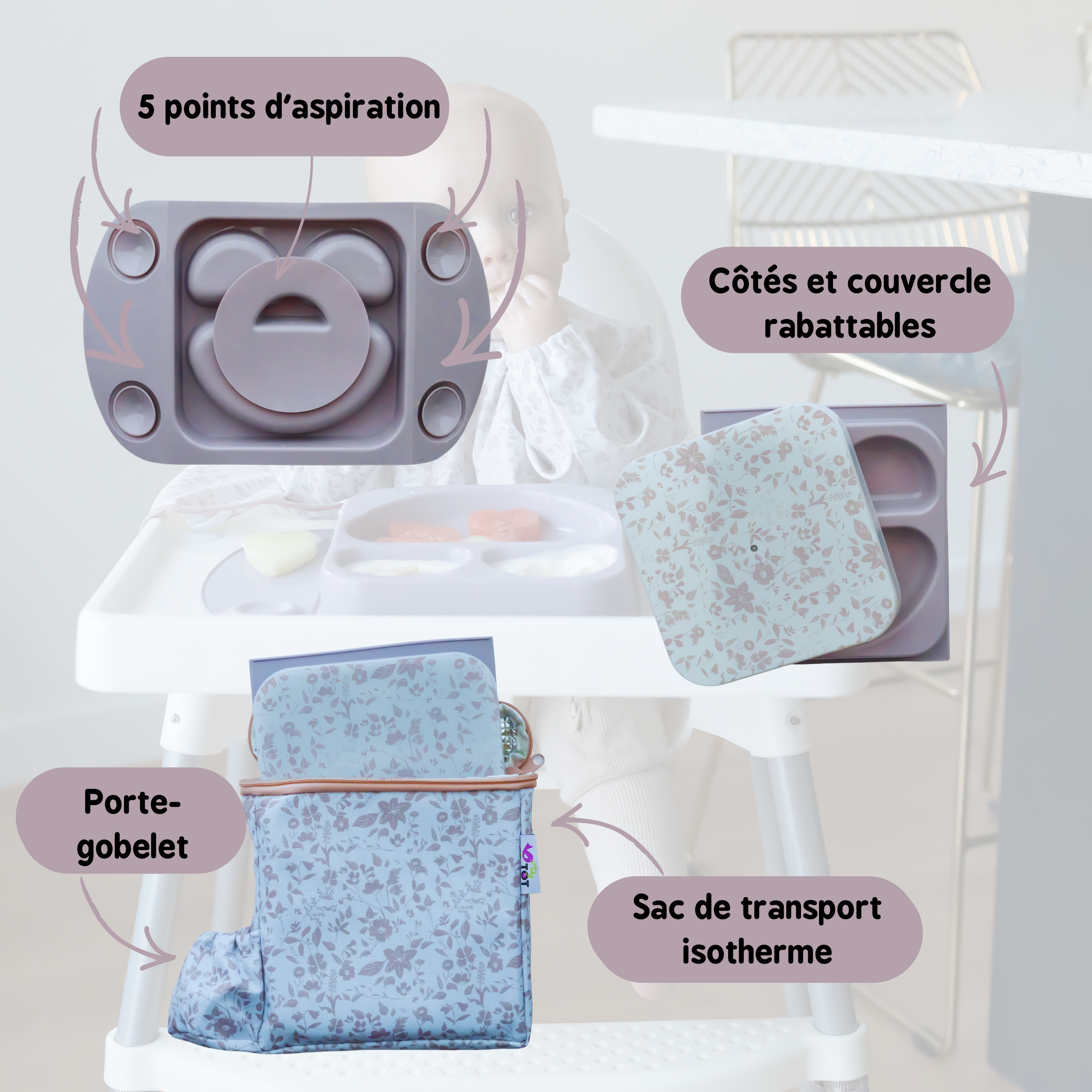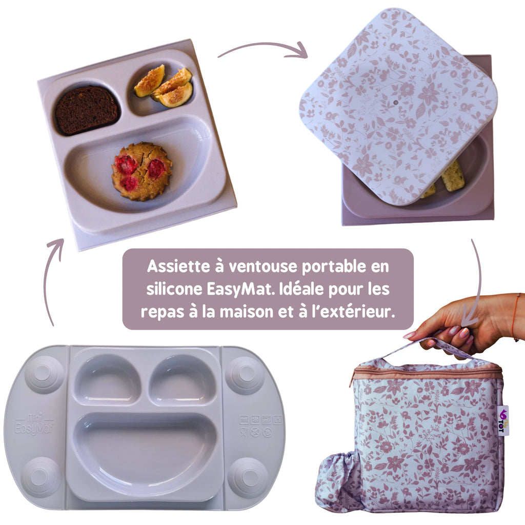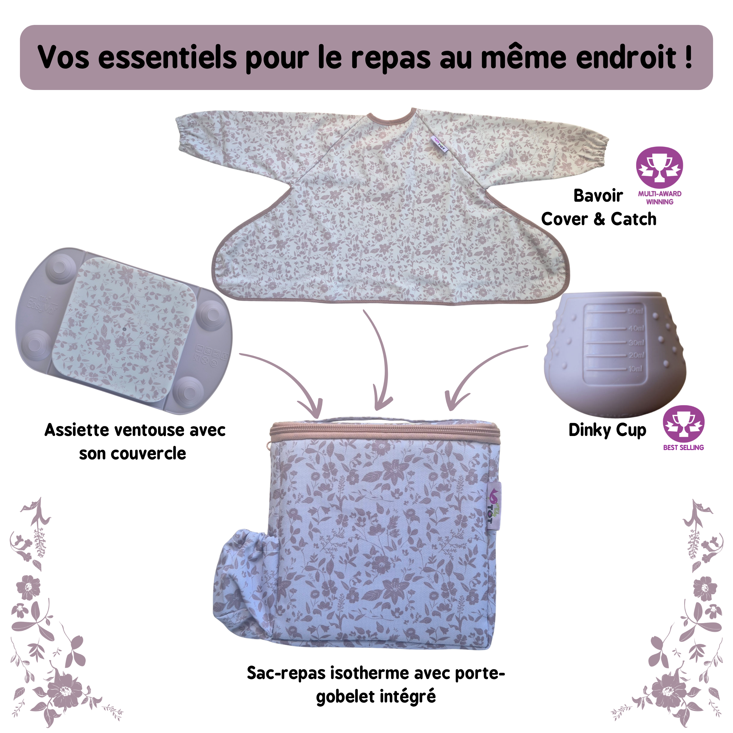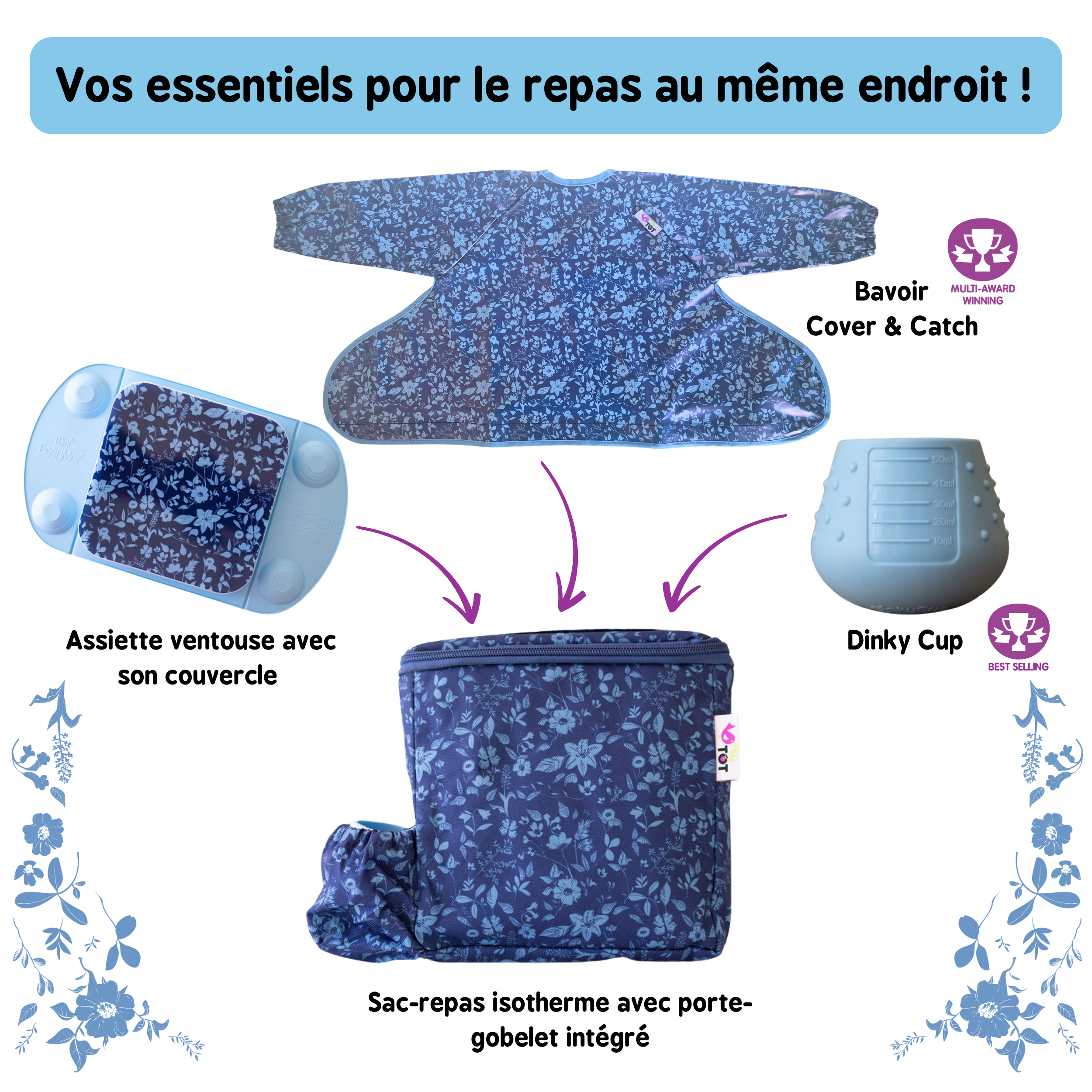 Tout se range facilement dans un sac-repas isotherme muni d'une poignée. Conçu avec un porte-gobelet/bouteille intégré et une poche arrière pour ranger des lingettes ou un bavoir de rechange.