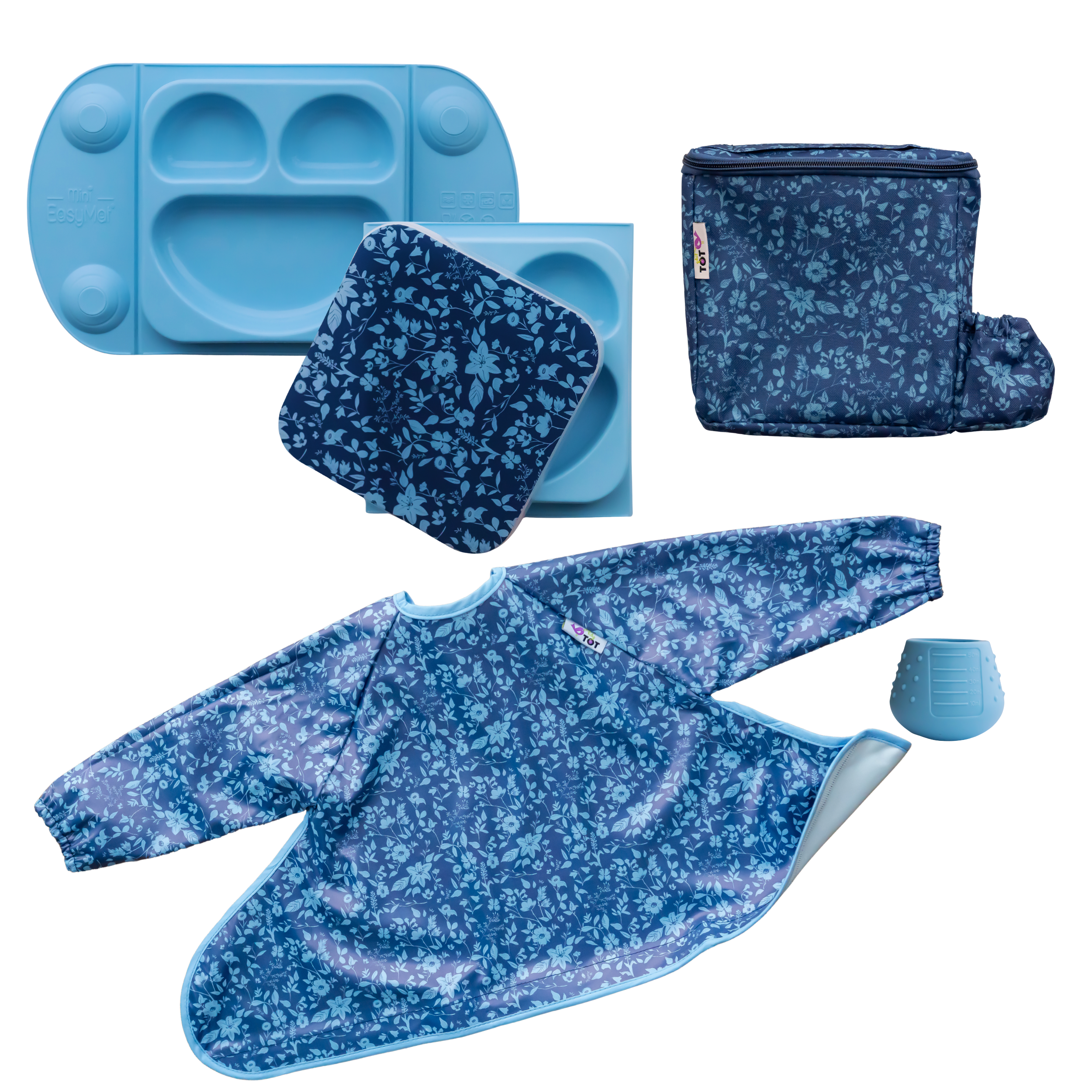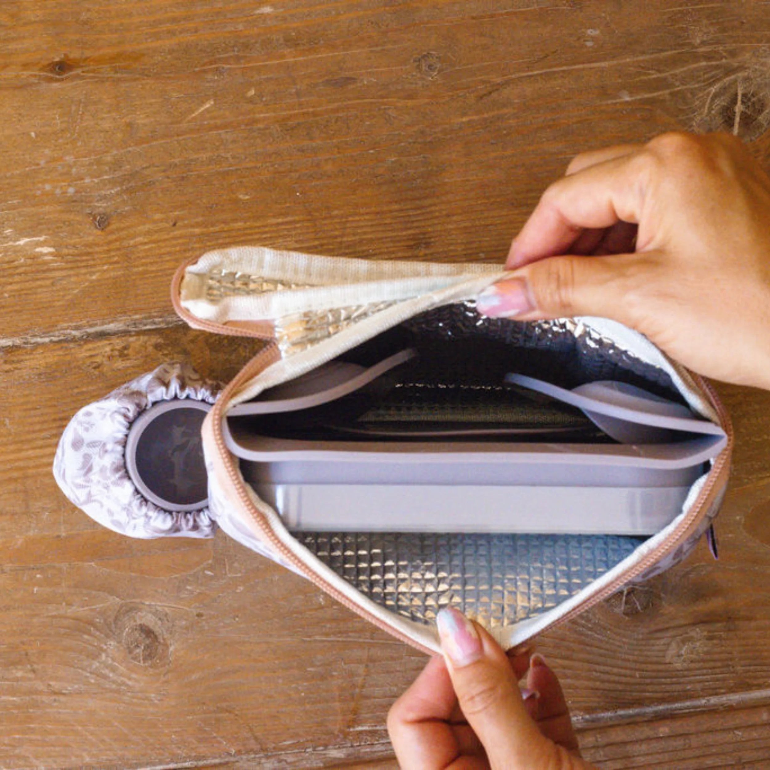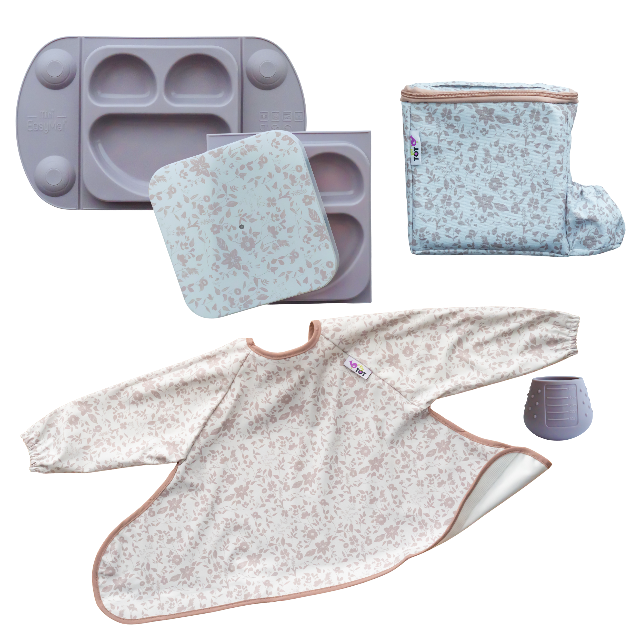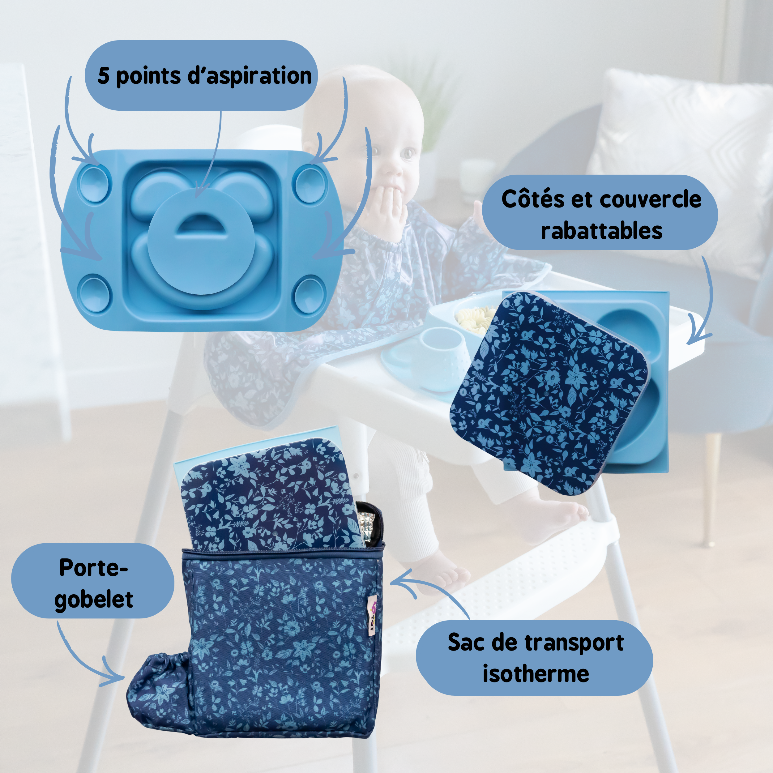 Tout se range facilement dans un sac-repas isotherme muni d'une poignée. Conçu avec un porte-gobelet/bouteille intégré et une poche arrière pour ranger des lingettes ou un bavoir de rechange.