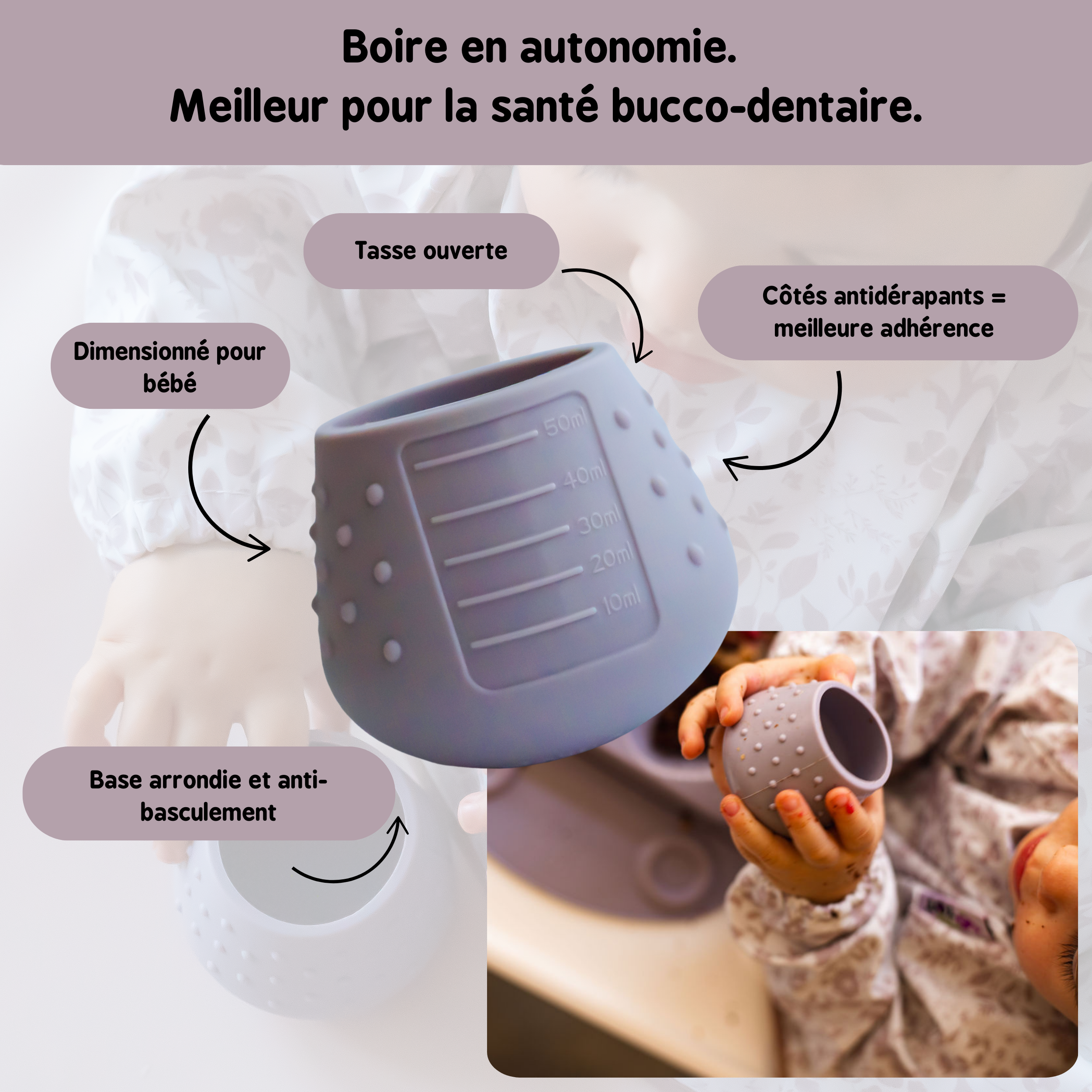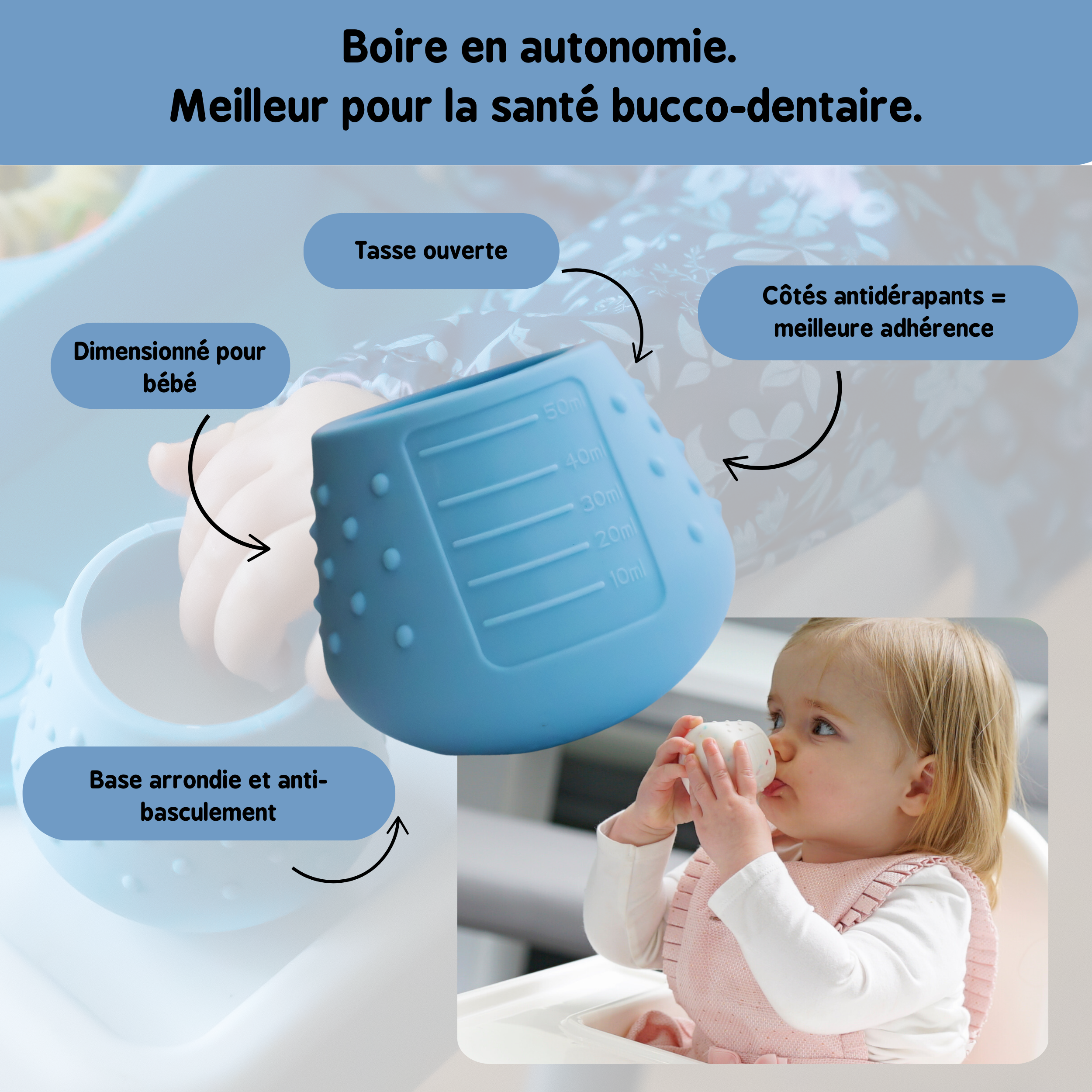 Boire à la tasse ouverte permet de renforcer les muscles de la bouche, de la mâchoire, de la langue et des lèvres nécessaires à l'alimentation et à la parole, tout en étant plus doux pour les dents afin de prévenir les caries.