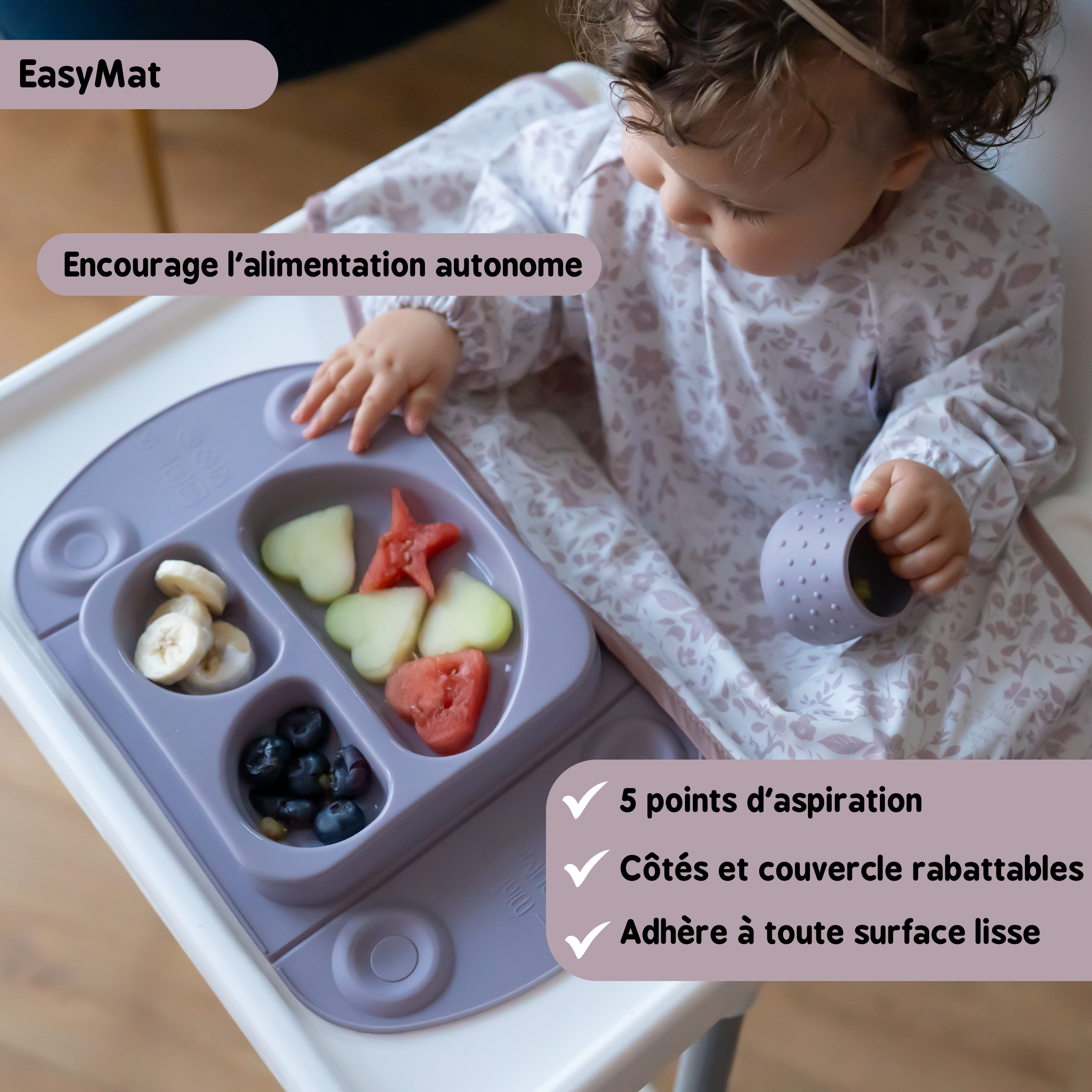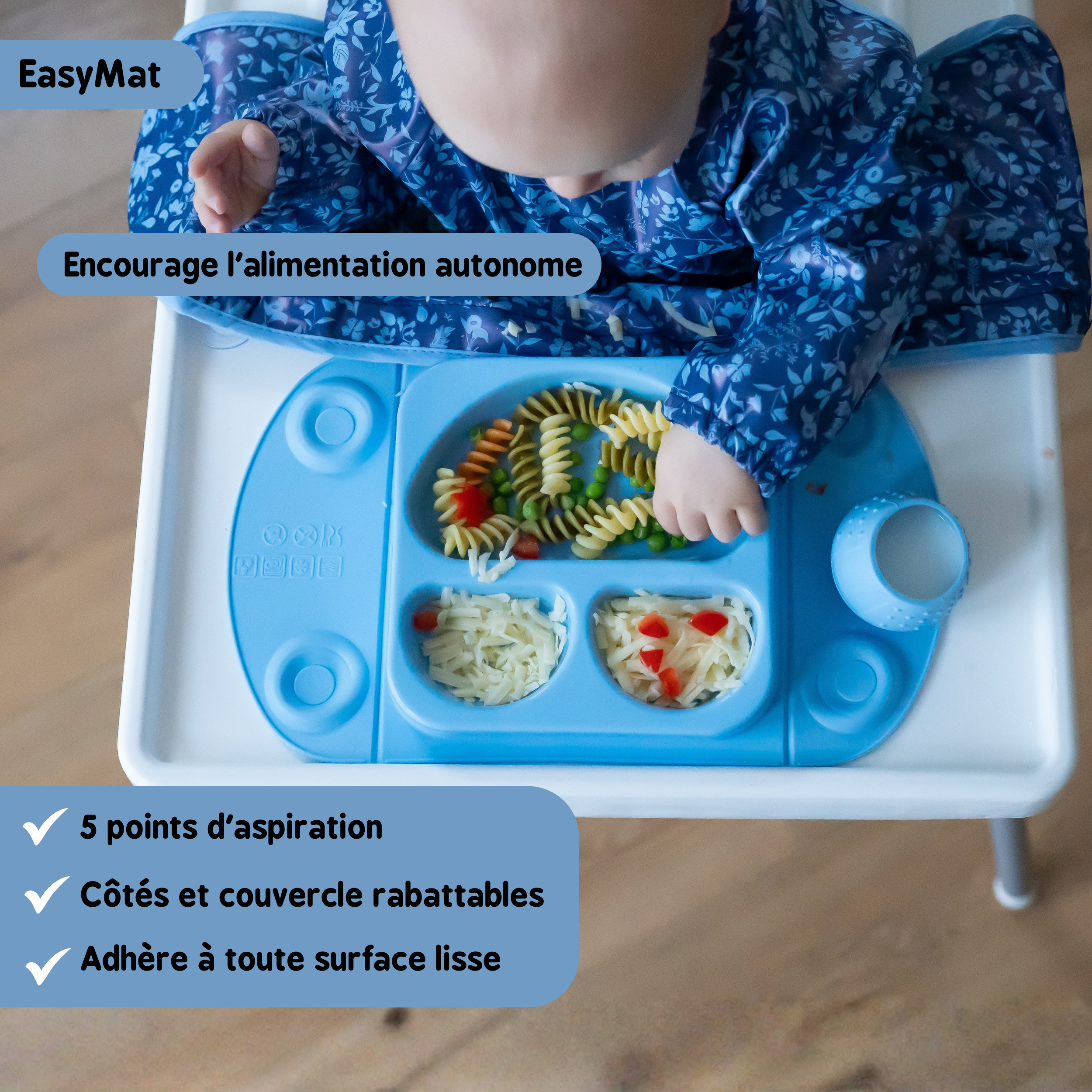 L'EasyMat – notre toute nouvelle assiette à ventouse en silicone avec couvercle. Cette assiette innovante dispose de 5 points d'adhérence pour une prise optimale.