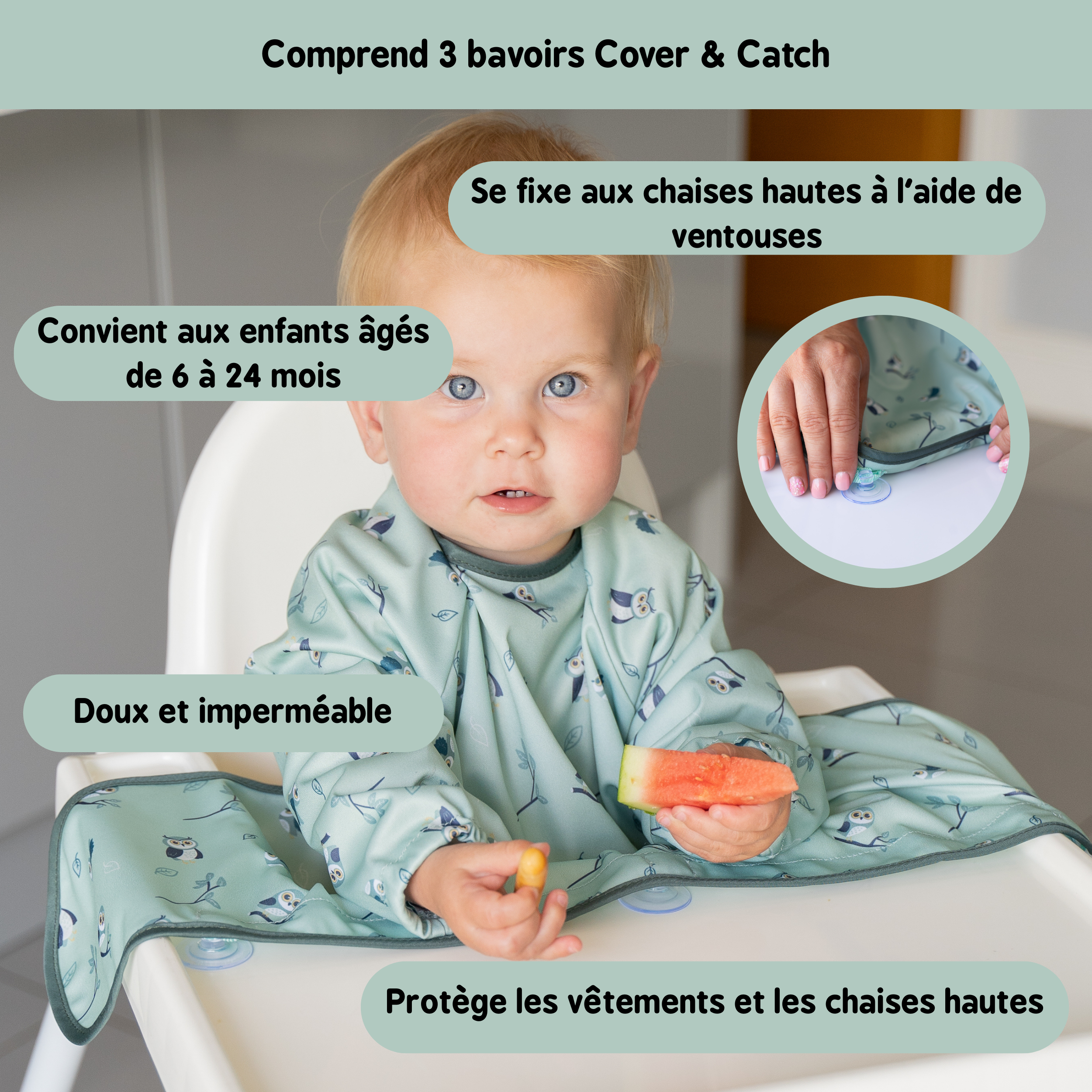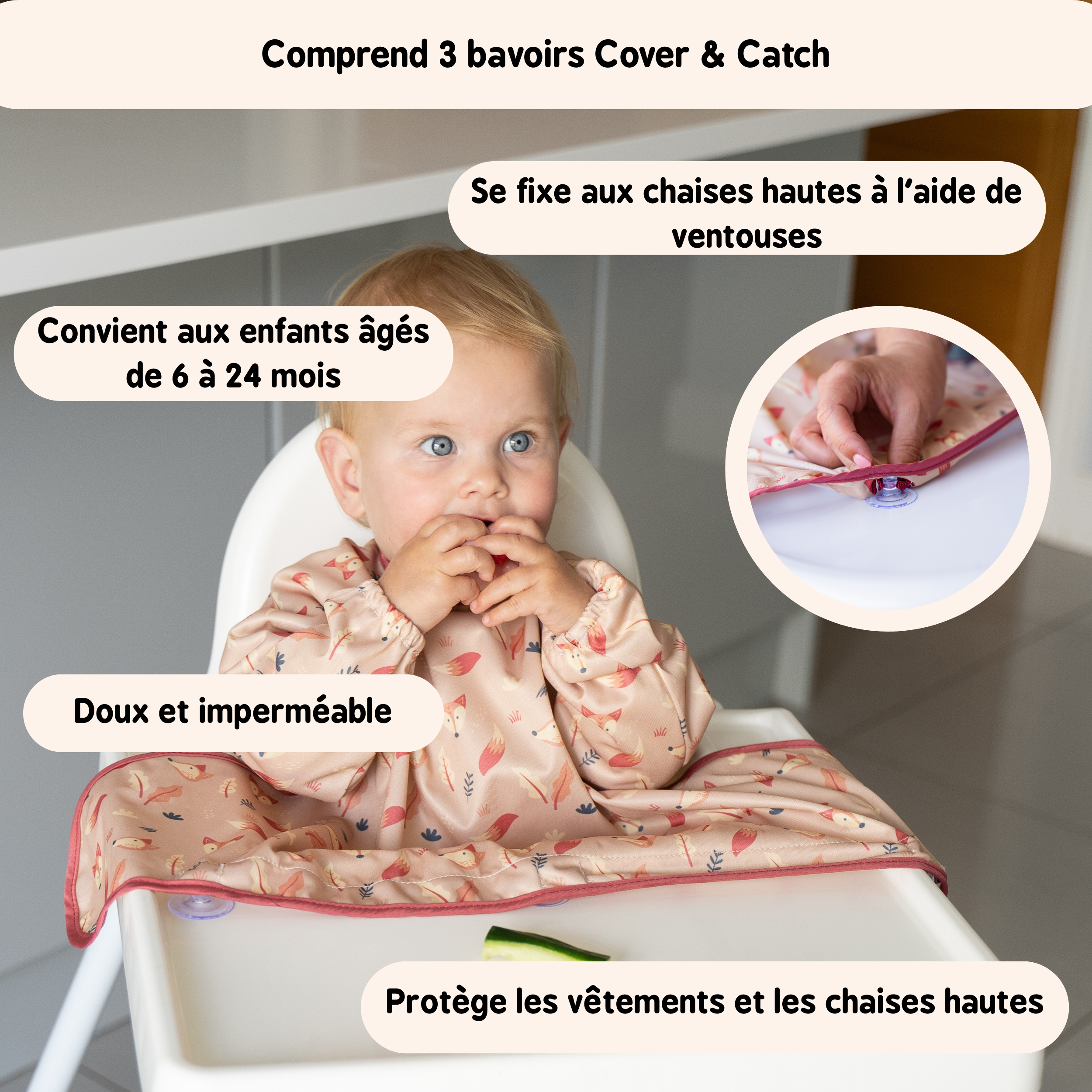 Mettez le bavoir à votre bébé, puis asseyez-le dans sa chaise haute ou son réhausseur de table puis collez les ventouses sur la chaise haute, le plateau ou sur la table.