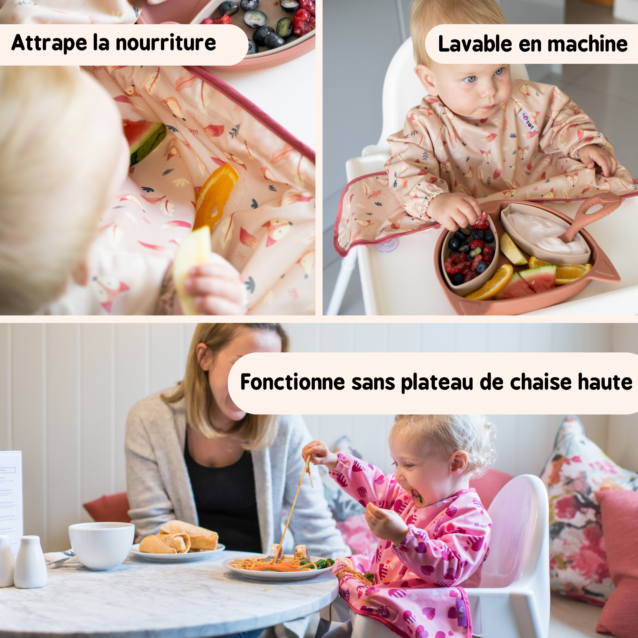Avec son design compact, ce bavoir convient pour toutes chaises hautes ou réhausseurs de table et peut être utilisé avec des bols ou assiettes à ventouses.