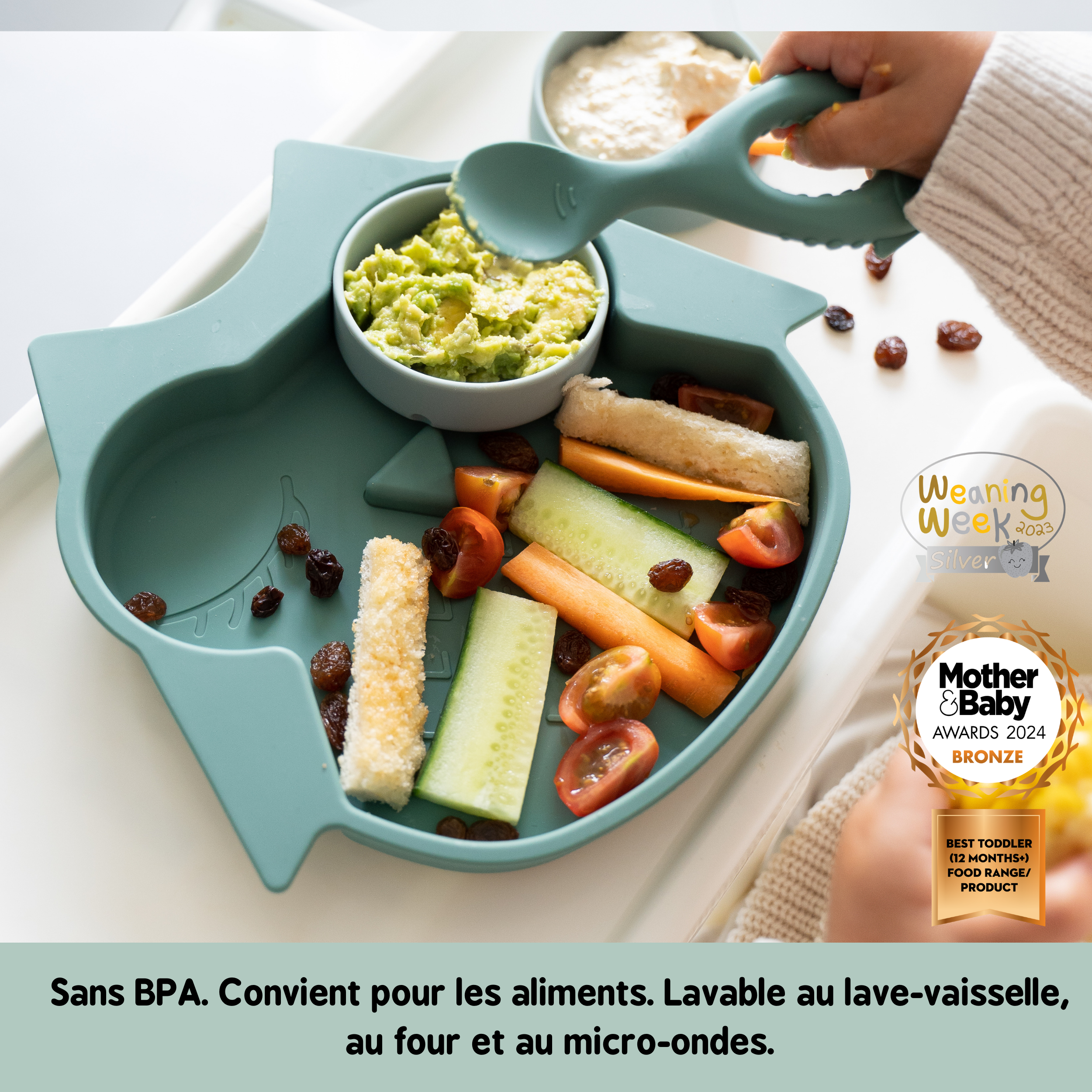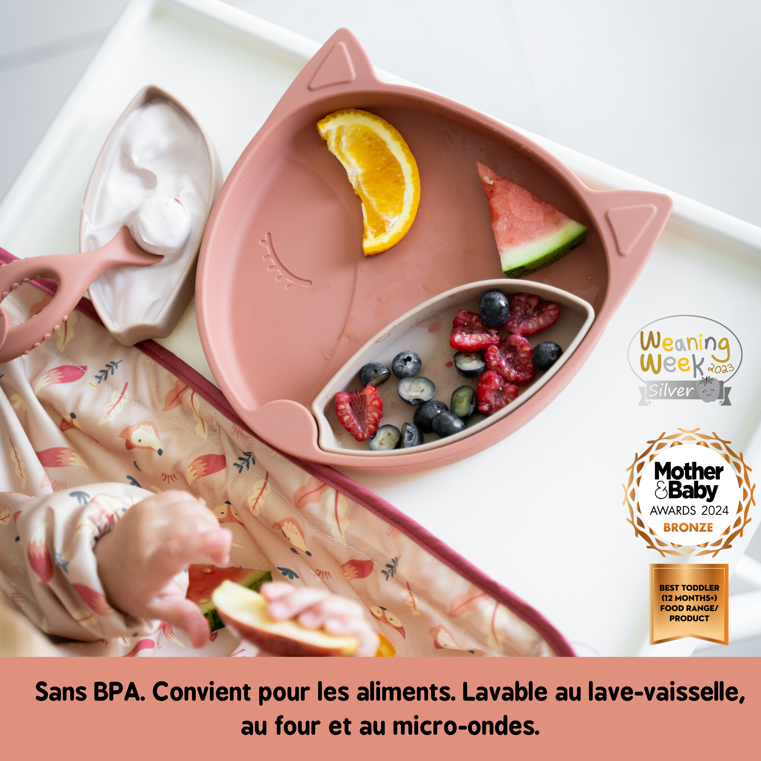 1 x Assiette à ventouse en silicone avec deux pots amovibles avec couvercles.