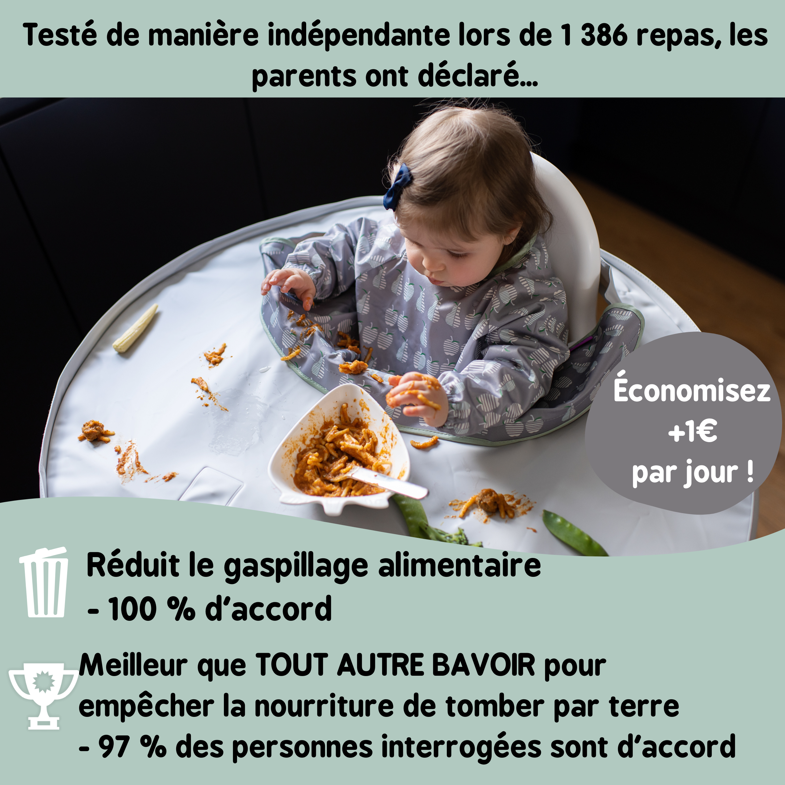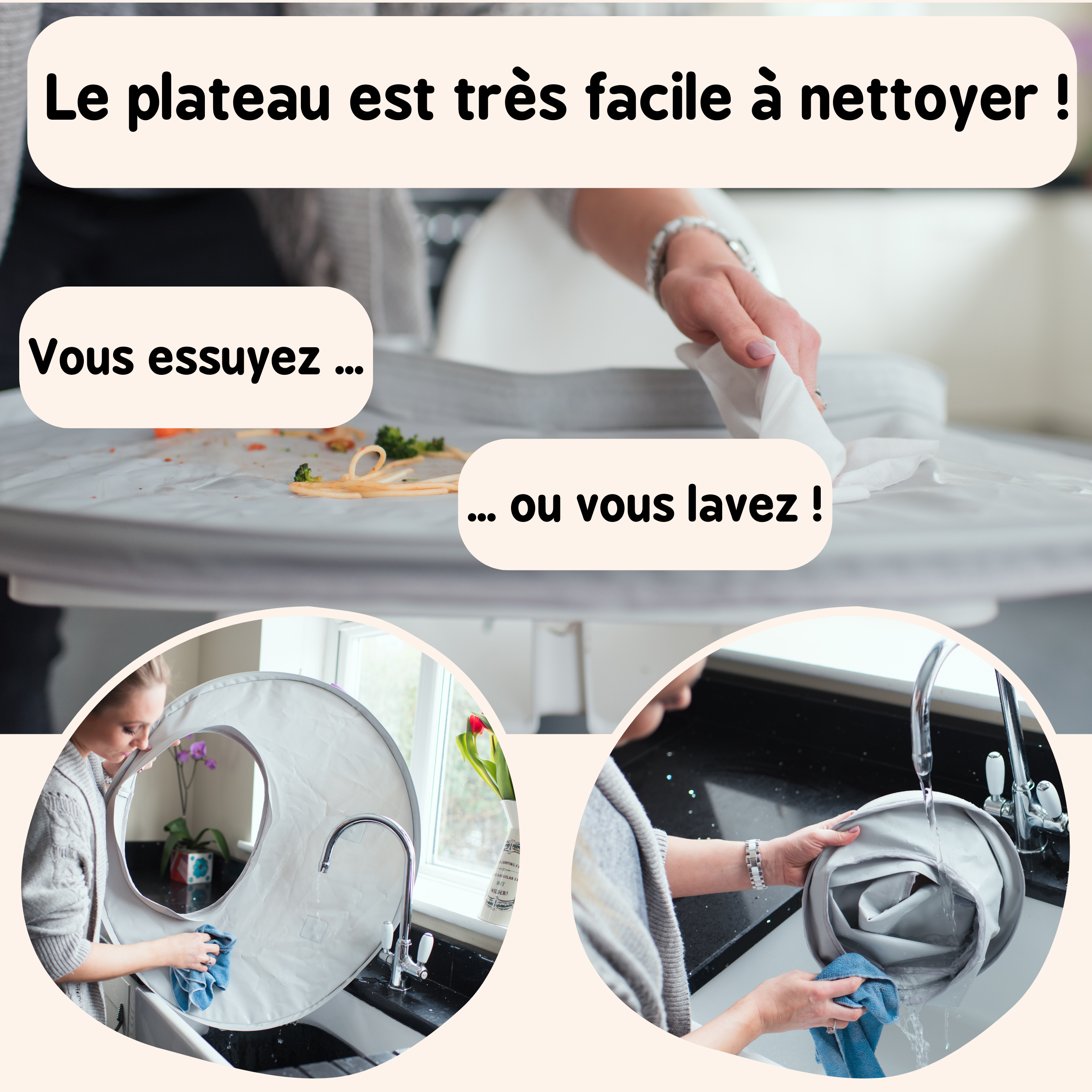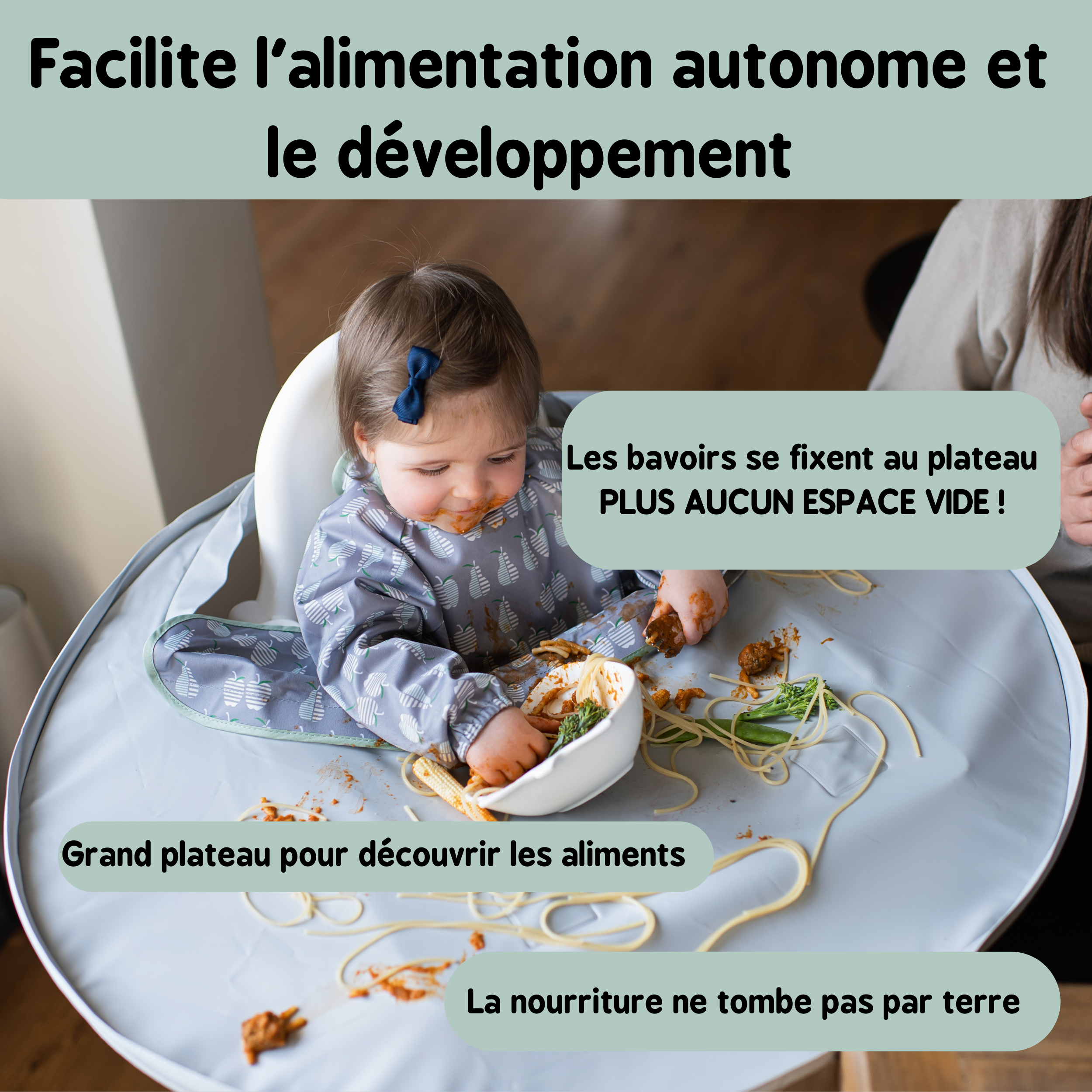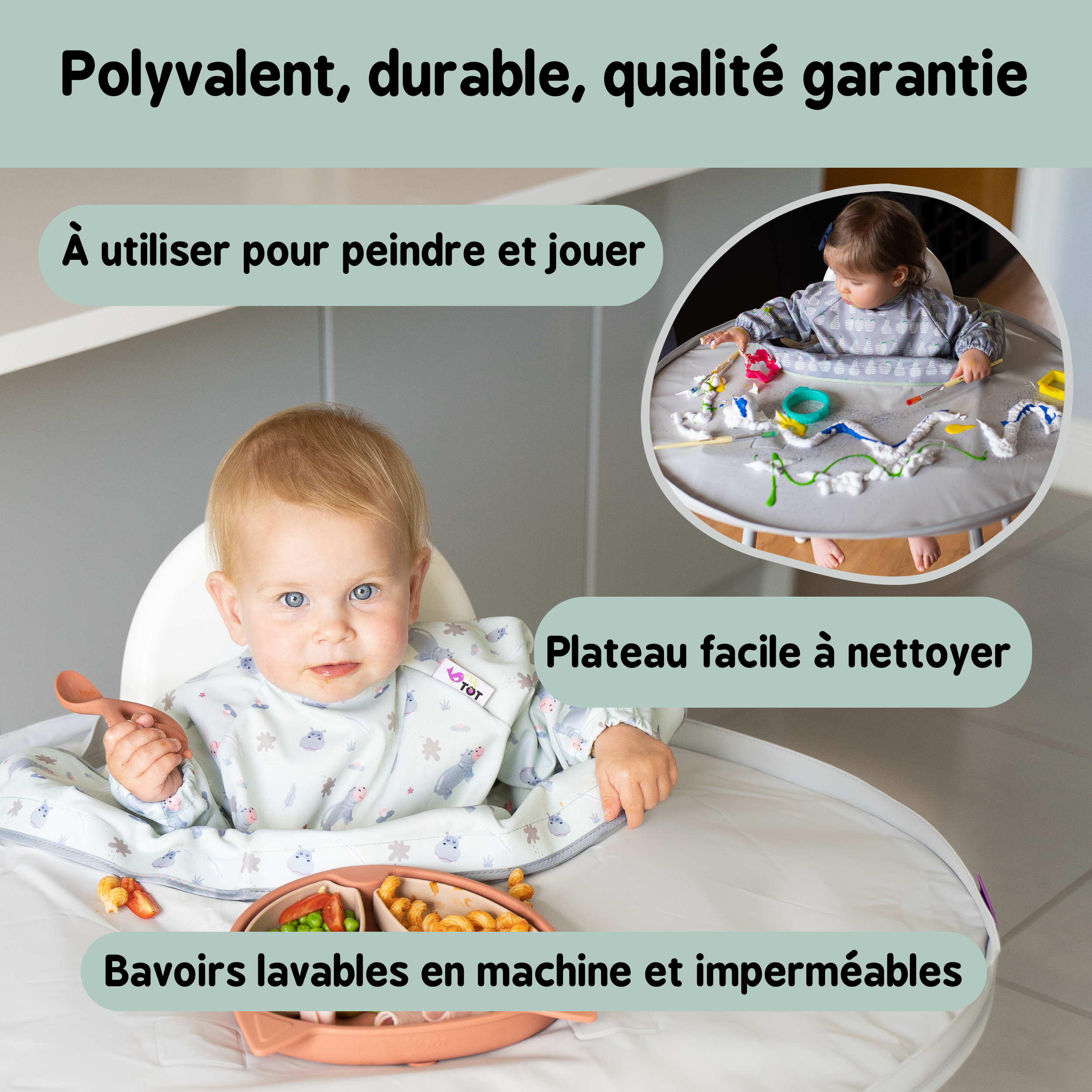 - Facile à nettoyer – essuyez au chiffon le plateau et passez le bavoir en machine