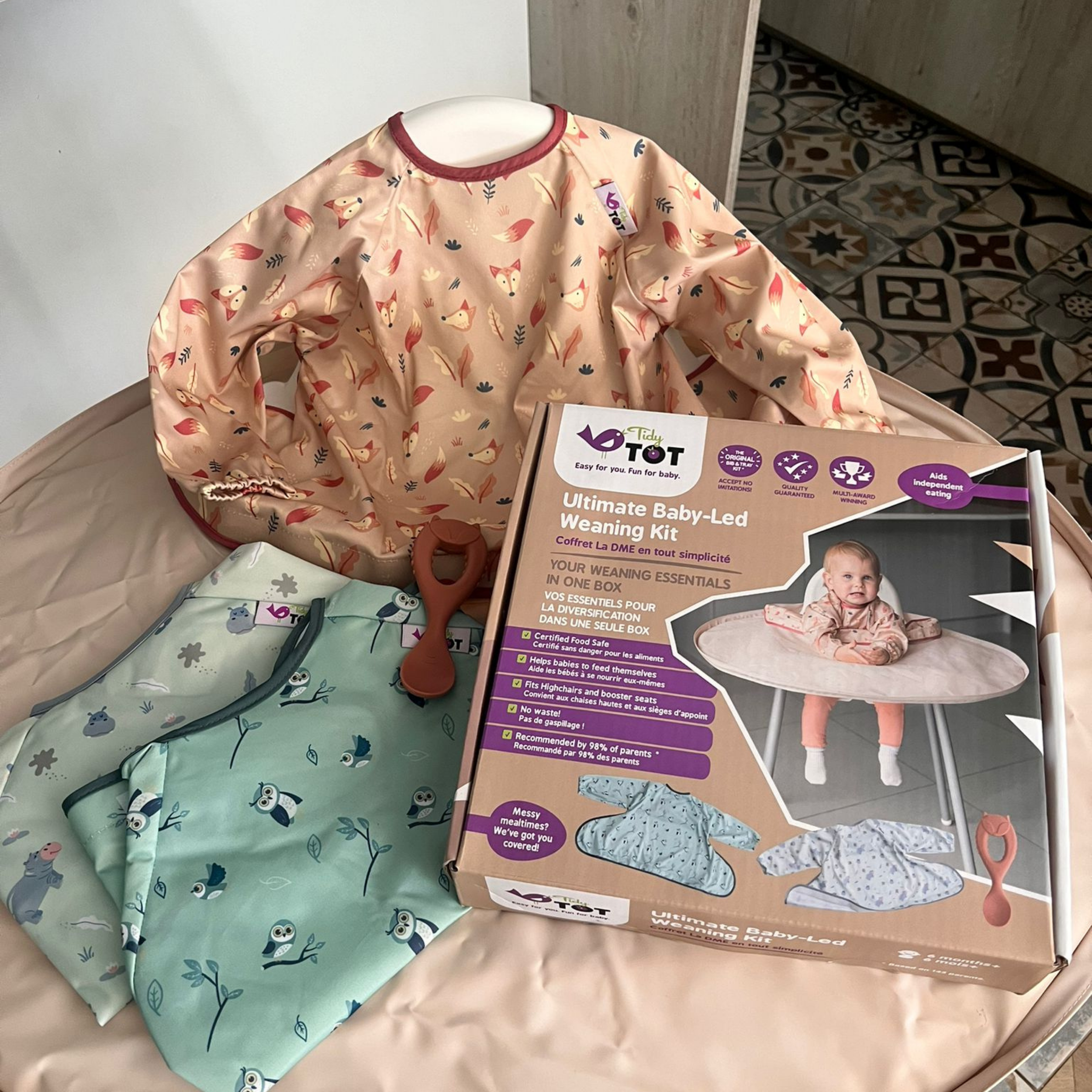 Ce lot contient notre emblématique Kit Bavoir & Plateau en Gris Perle plus DEUX bavoirs supplémentaires à un excellent rapport qualité/prix. Seulement €58,95 pour 3 bavoirs à manches longues et notre plateau pour les repas/jeux sensoriels qui a été primé!