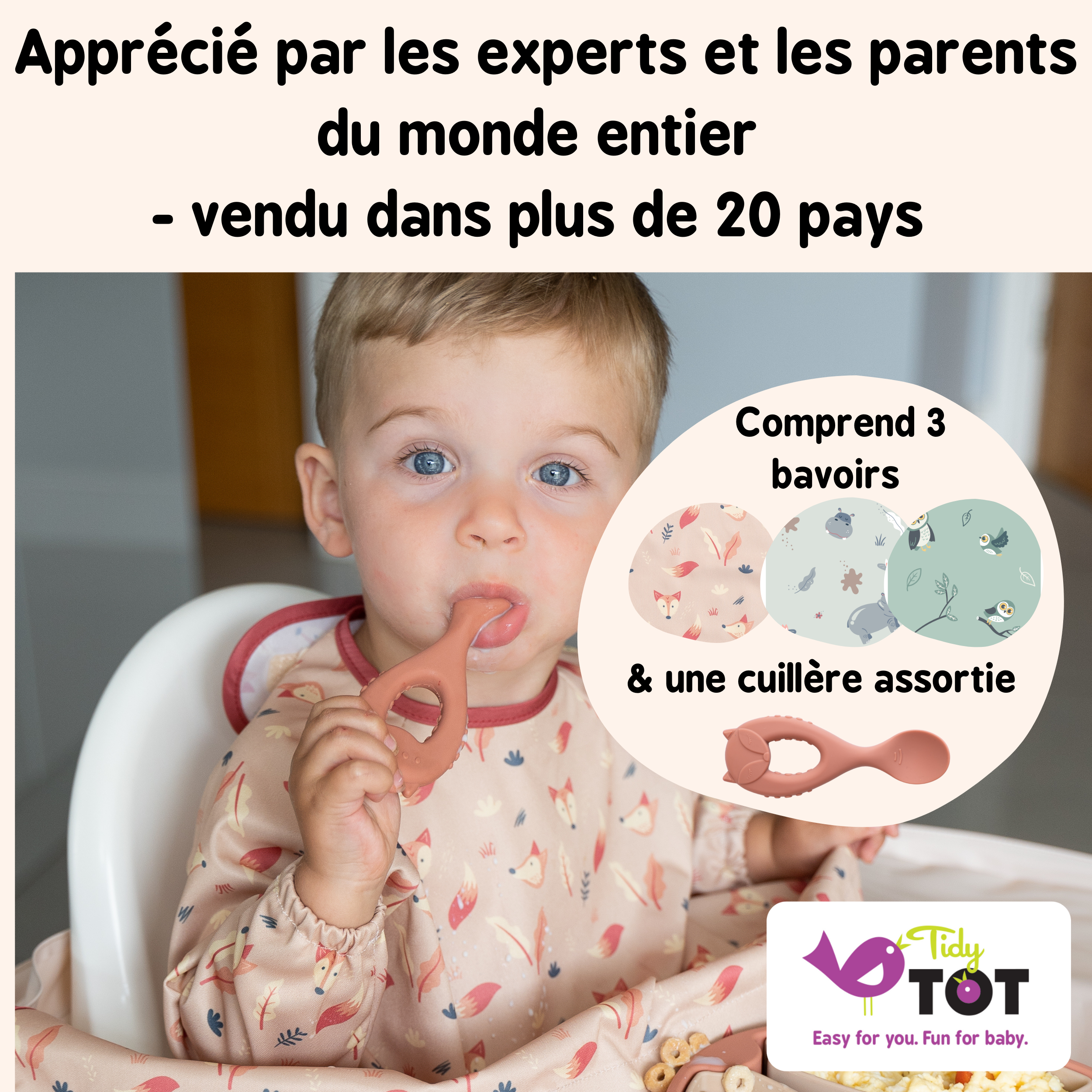 Bavoir Tidy Tot : Notre toute nouvelle version du bavoir est maintenant entièrement résistante à l’eau et est fabriquée en tissu très doux, le bavoir est donc plus facile à laver et plus confortable à porter.