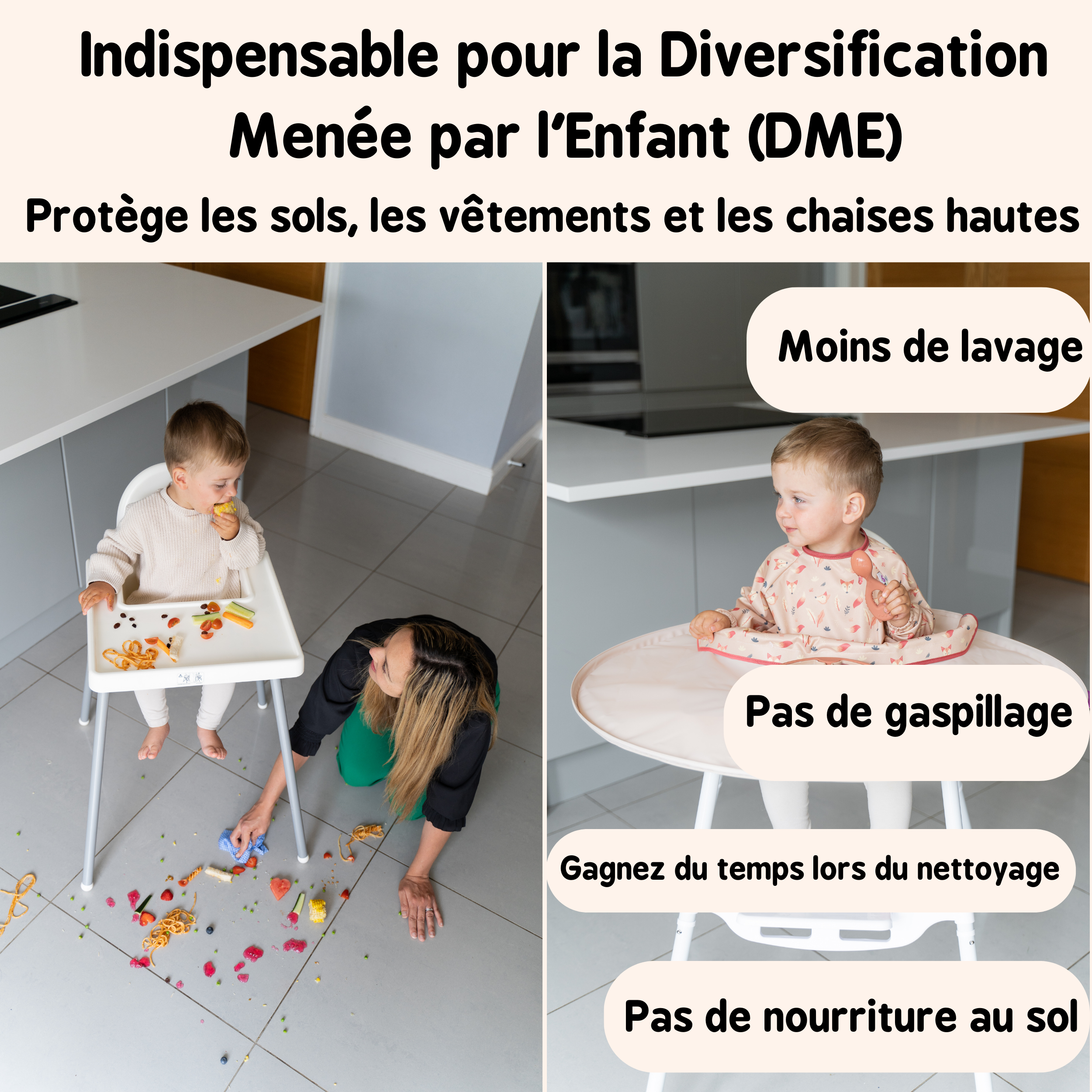 Que vous suiviez l’introduction des solides traditionnelle en purée, la Diversification Menée par l’Enfant (DME) ou un peu des deux, ce produit essentiel de la diversification alimentaire aide à réduire le lavage et nettoyage après chaque repas salissant.