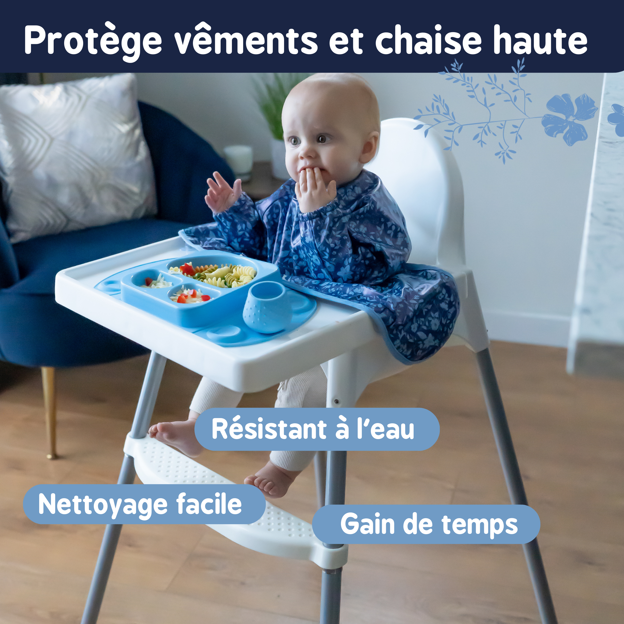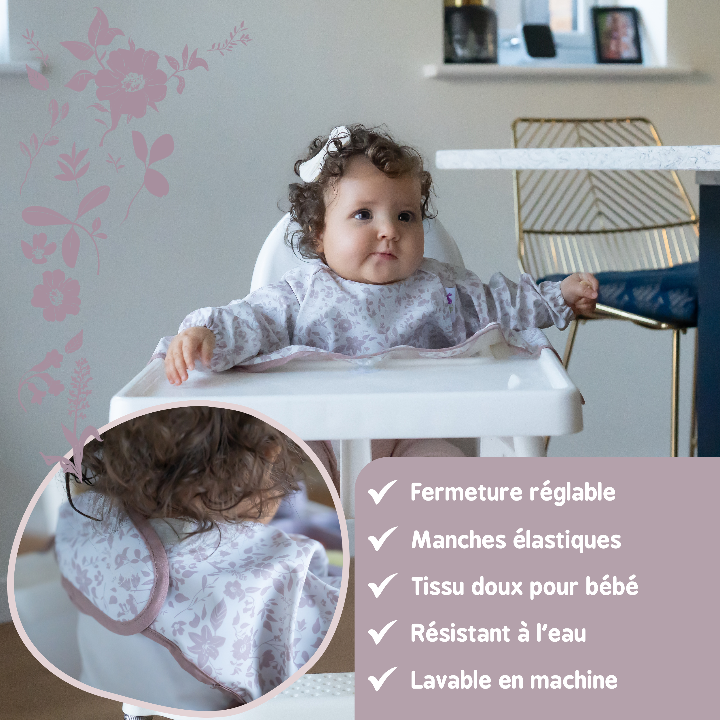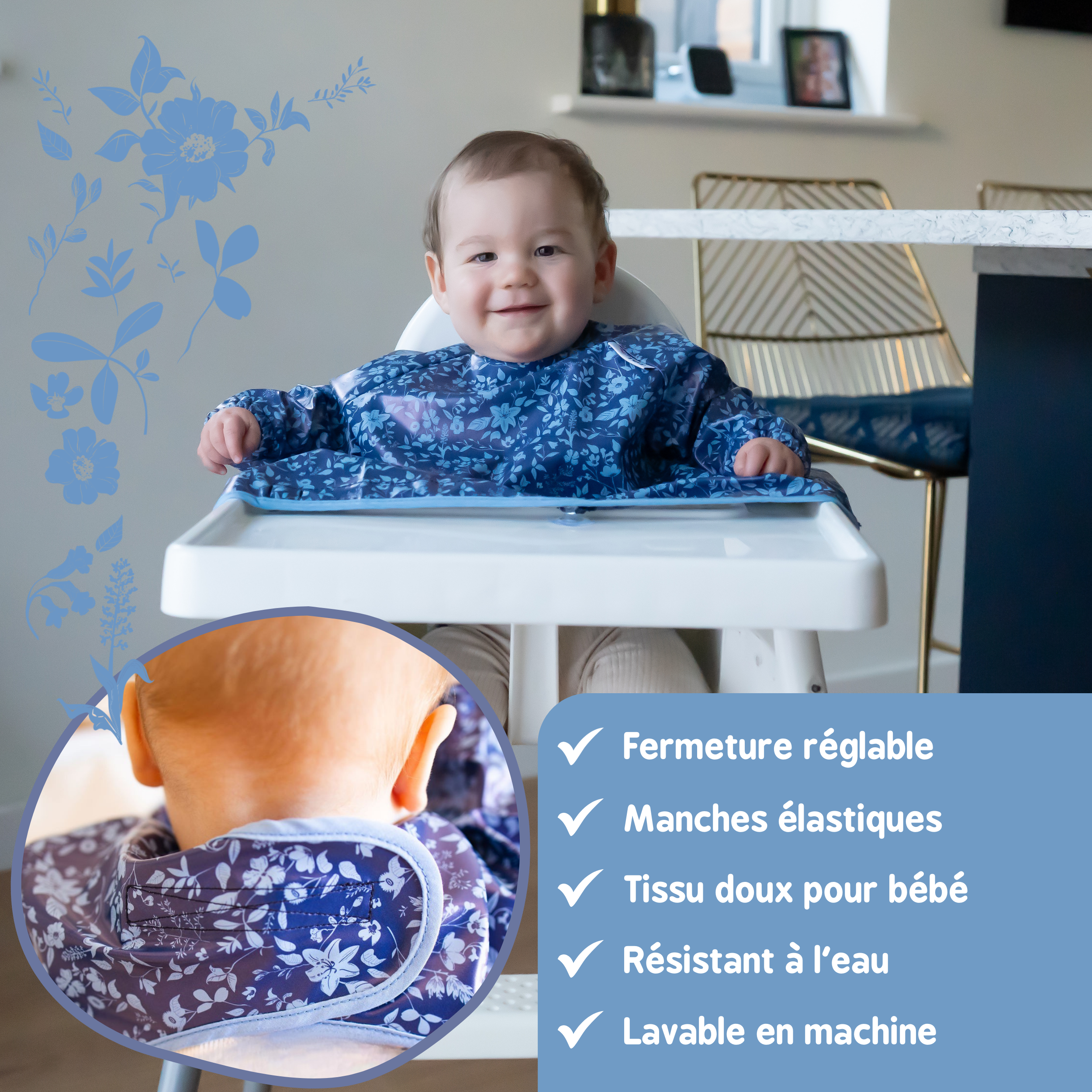 Avec ses manches longues pour une protection complète, une fermeture au cou ajustable et sa matière super douce et résistante à l’eau, ce bavoir protège entièrement les vêtements et le siège des chaises hautes des salissures et éclaboussures de la diversification alimentaire.
