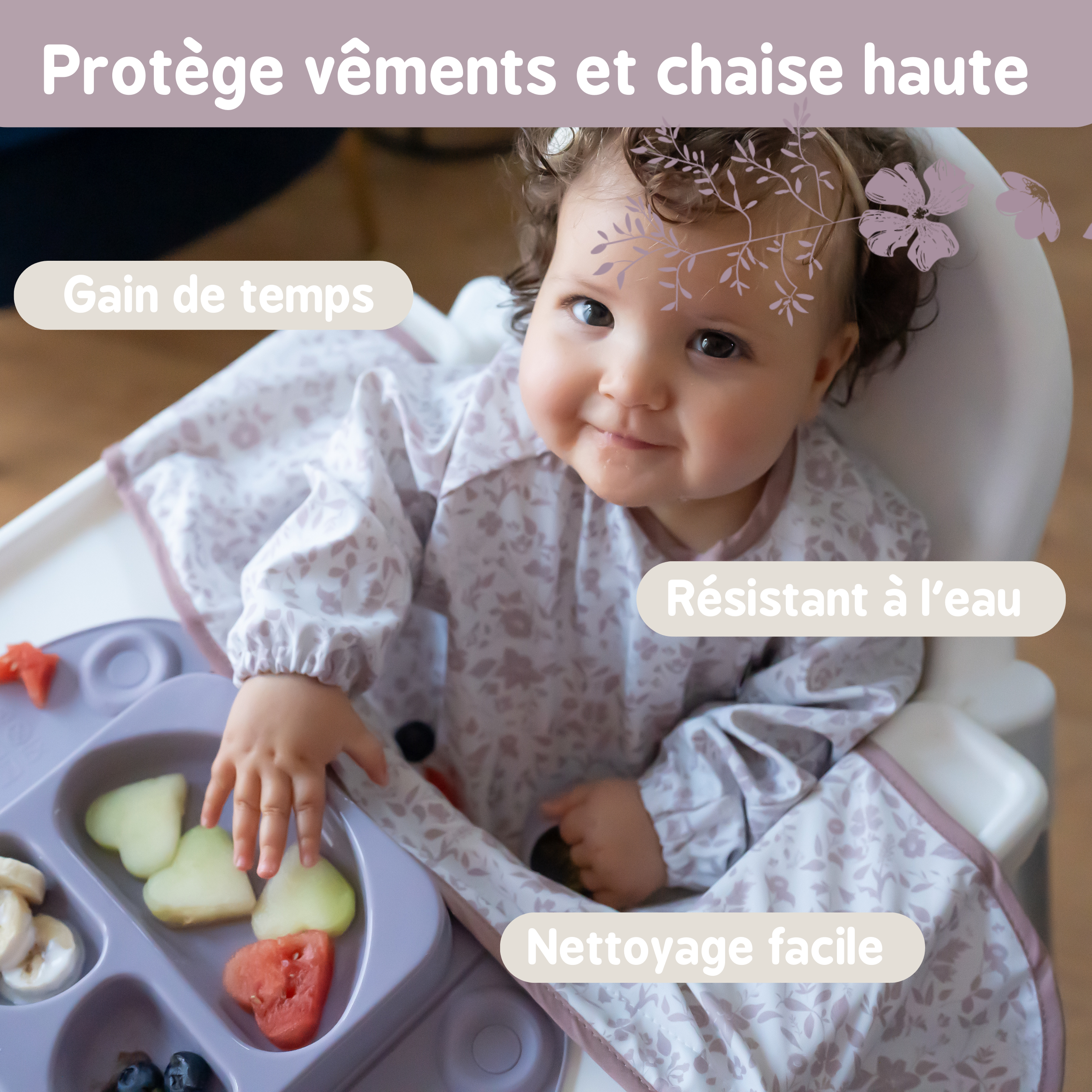 Mettez le bavoir à votre bébé, puis asseyez-le dans sa chaise haute ou son réhausseur de table puis collez les ventouses sur la chaise haute, le plateau ou sur la table.
