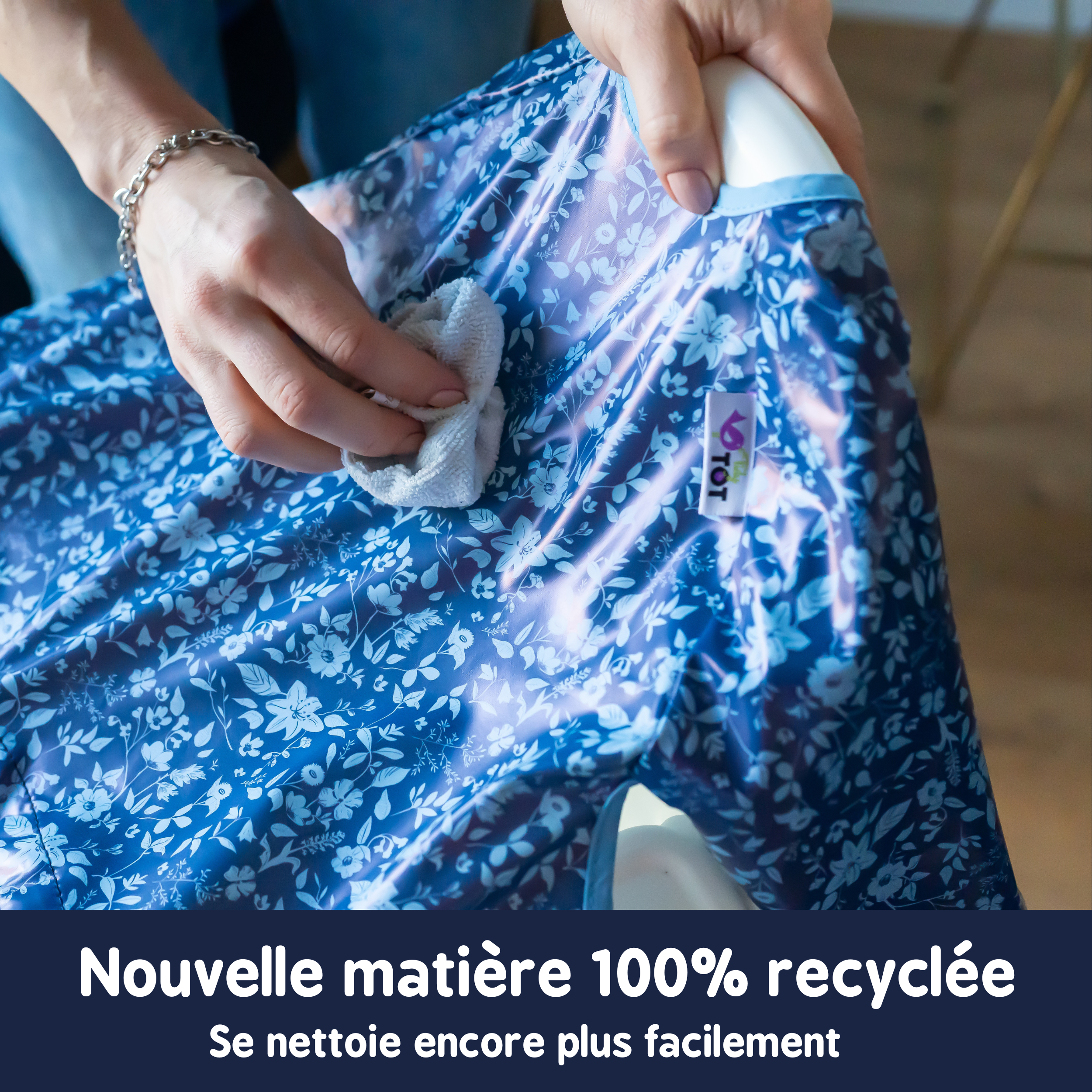 Super facile à nettoyer, essuyez simplement le bavoir au chiffon ou bien passez-le à la machine à la fin du repas et séchez-le à l’air libre pour qu’il soit prêt pour le repas suivant!